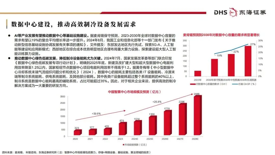 如果说家电市场是存量厮杀,那么商用制冷,特别是数据中心冷却,则是全行业公认的增量风口。麦肯锡预测,2023-2030年全球数据中心容量需求将以19%的复合年增长率提升。随着AI训练和推理需求的普及,机柜功率密度大幅提升,制冷系统的能耗占比已超过35%,PUE(电能利用效率)指标成为硬约束。