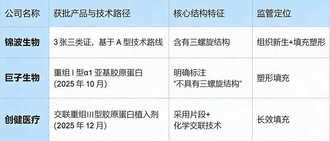 以巨子生物为代表,其获批产品直白标注“不具有三螺旋结构”,坦率地选择了功能片段化与产业化效率,开辟了一条务实的赛道。
