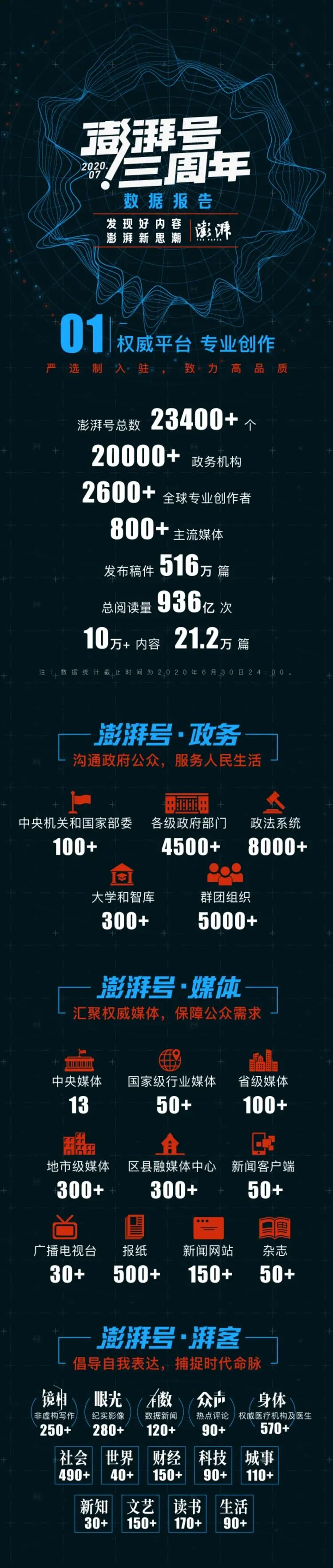 2020年7月,澎湃新闻在平台化战略发展下诞生的澎湃号正式上线三周年。在这三年时间里,澎湃号在产品形态、运营模式和品类拓展等持续迭代、创新。截至目前,超过2.3万个来自政府、新闻媒体和自媒体专业创作者分别在“政务”、“媒体”和“湃客”平台上进行创作。澎湃号内容总阅读量超过936亿次,阅读数10万+文章超过21.2万篇,累计发布逾516万篇优质内容,同比增长近160%。