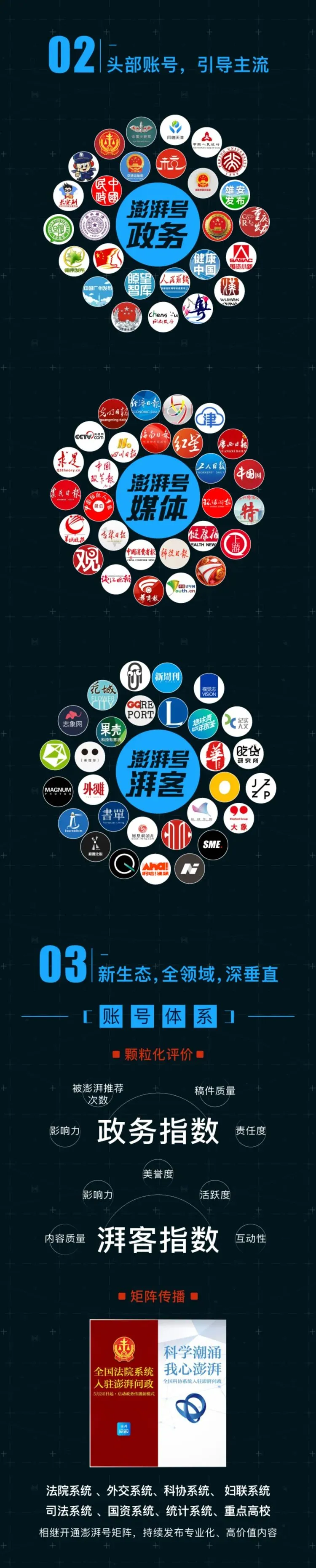其中,“政务号”致力于用优质平台凝聚政务机构的力量,致力于用主流价值纾解政务宣传的流量焦虑和算法焦虑,致力于搭建政府部门和公众直接沟通的桥梁。经过三年的持续扩展与迭代升级,澎湃政务号已成为全国唯一以各地区各系统的政务信息公开、改革发展成果和故事、文化品牌等为重点和凸显时政专业精神的政务平台。