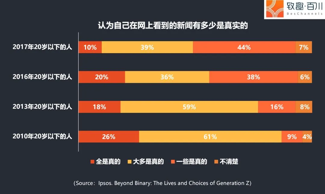 5 仅有49%的95后认为网上的新闻大多是真实的,但却有60%的95后表示他们认为街上遇到的人说的是实话。