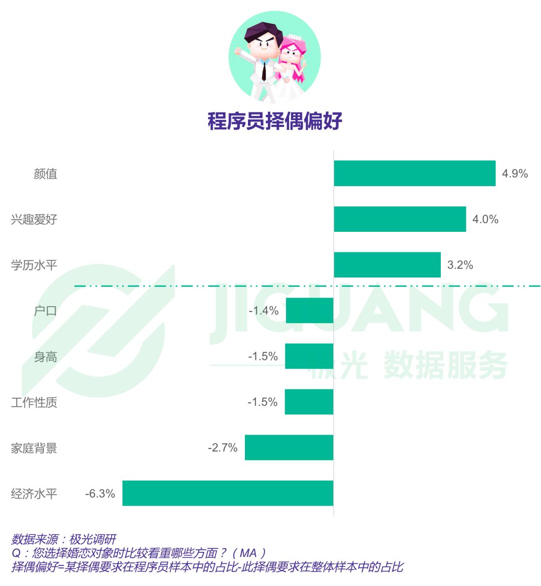 相比整体受访者,受访程序员更为关注颜值、兴趣爱好和学历水平,但不太在乎对方的经济水平、家庭背景、工作性质、身高和户口