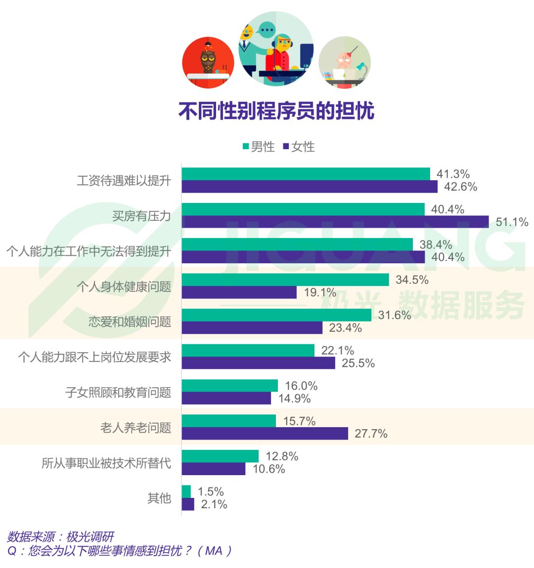 51.1%的受访女性程序员担心买房压力,同时对个人能力的提升、老人养老以及工资待遇都表现出比男性程序员更大的压力