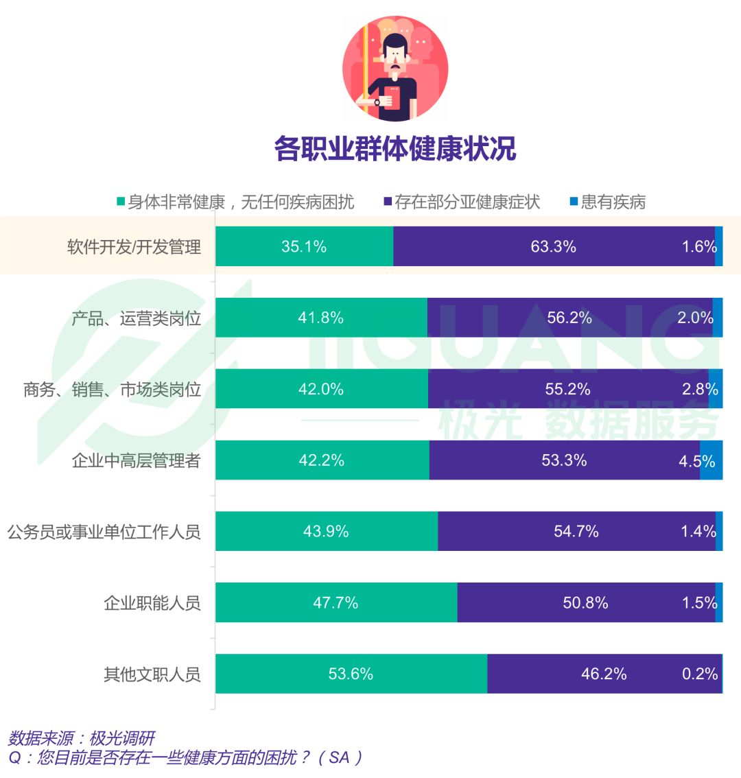 63.3%的受访程序员目前存在部分亚健康症状,仅35.1%程序员认为自己身体健康无任何疾病困扰,相比其他职业,程序员可谓是不折不扣的“健康难民”