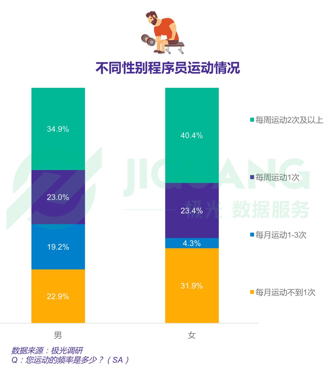 男性程序员中,34.9%每周运动2次以上,23%每周运动1次