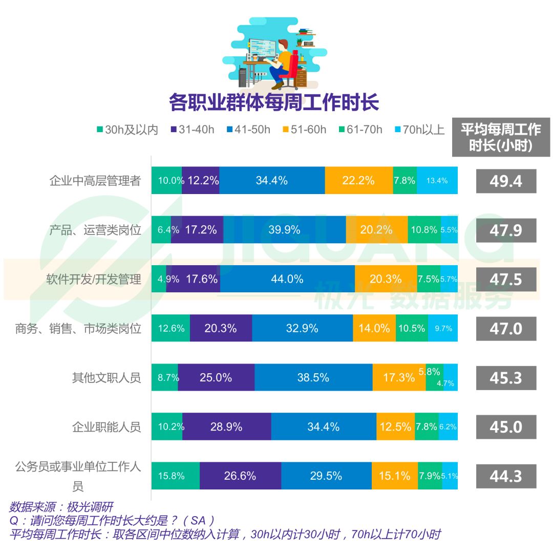 受访程序员平均每周工作时长约47.5小时,仅低于企业中高层管理者和产品、运营类岗位工作人员