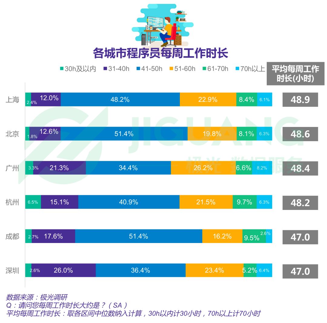 深圳程序员较闲,平均每周工作时长为47.0小时,28.6%每周工作时长在40小时及以内