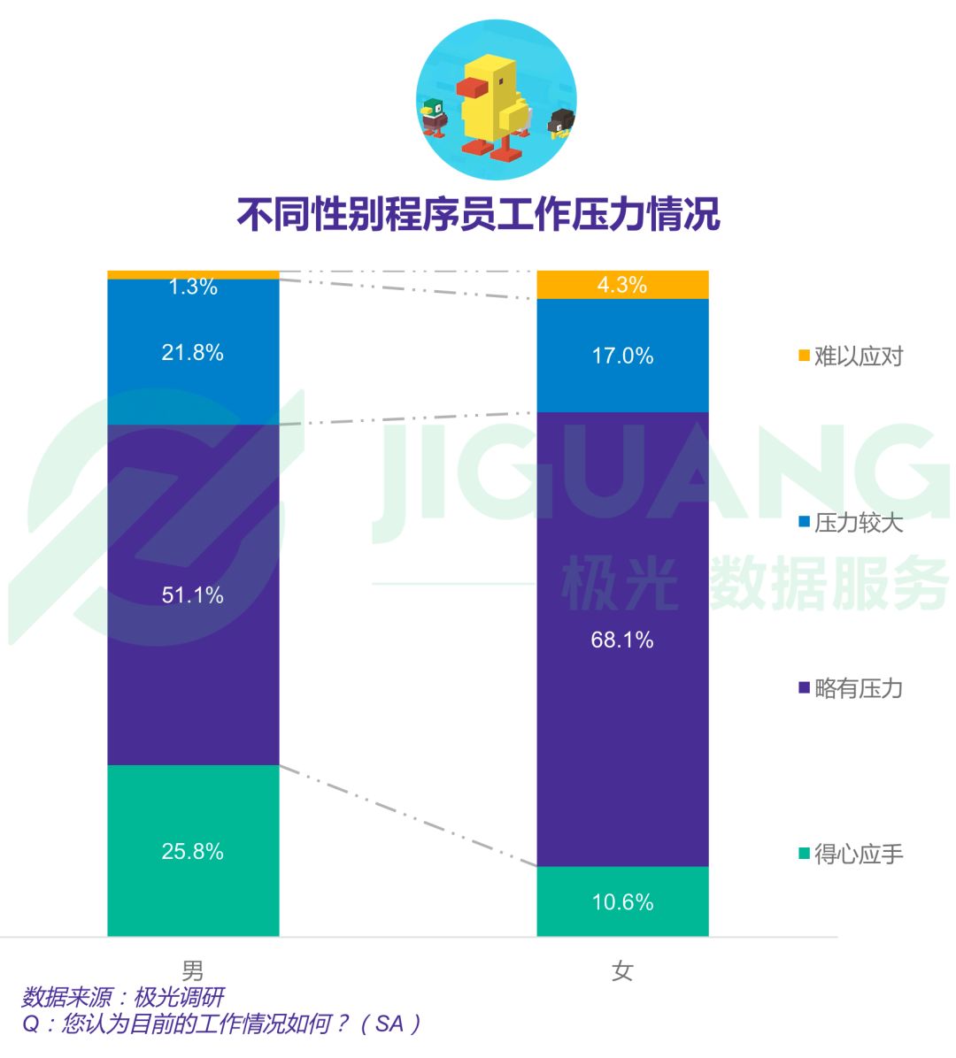 21.8%的受访男性程序员认为目前的工作压力较大,17%的受访女性程序员持同样态度