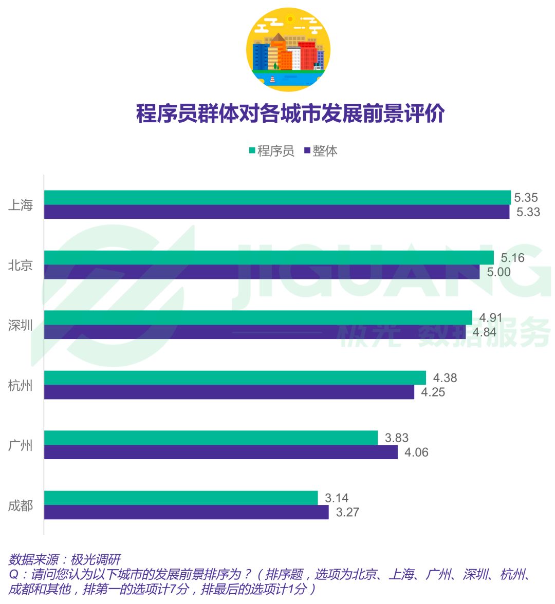 受访程序员群体认为,各主要城市发展前景排序为:上海-北京-深圳-杭州-广州-成都