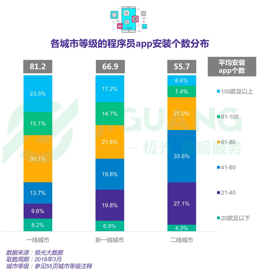 巨能装:一线城市程序员平均安装81.2个app,明显多于新一线和二线城市程序员