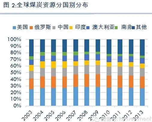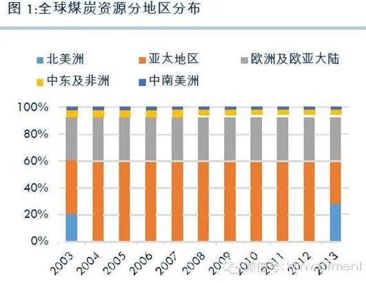 煤炭是世界储量最丰富、分布最广泛、使用最经济的能源资源之一。根据世界能源委员会的数据,截至2013年,全球已探明煤炭可采储量约8915亿吨,主要分布在亚太地区、北美和欧洲及欧亚大陆,三地合计储量占全球可采储量的95%其中,亚太地区占比32%,北美地区占比28%,欧洲及欧亚大陆占比35%。从国别来看,煤炭资源储藏最丰富的国家为美国、俄罗斯、中国、印度、澳大利亚和南非,上述6国的煤炭储藏占比约75%。其中美国、俄罗斯、中国和印度的占比均超过全世界总储藏的10%。