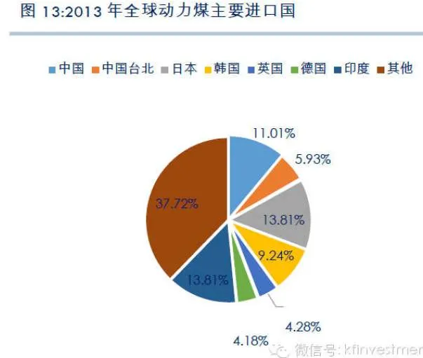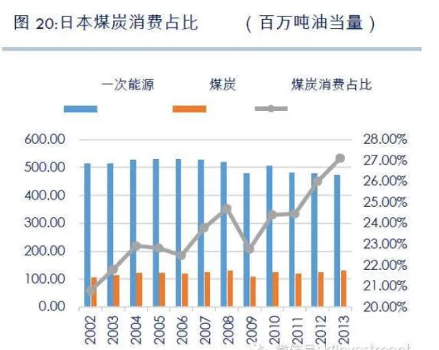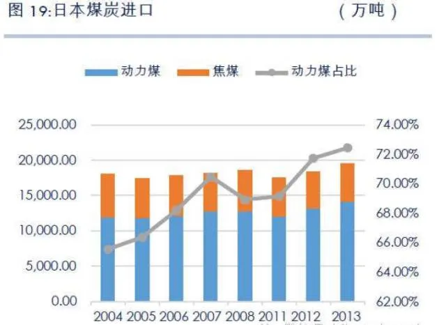 虽然煤炭在日本一次能源消费中占比一直比较小,但这不影响日本煤炭进口量长期保持全球第一的位置(自2012年被中国超越)至2013年,日本煤炭进口量1.96亿吨,占全球煤炭贸易量的14.65%。此外,日本煤炭的进口结构也是以动力煤为主,自福岛核事故后,日本动力煤进口占比保持7成以上。