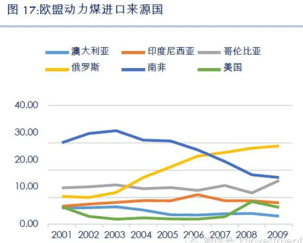 从图17中可看出,欧盟动力煤进口主要来自俄罗斯、南非、哥伦比亚三地。