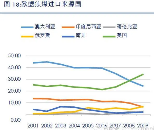 从图18中可看出,欧盟炼焦煤进口主要来自美国、澳大利亚两地。欧盟从这两个国家进口的炼焦煤在总进口总所占的比重始终高于50%,2001年这一比重达到最高的69%。此外,哥伦比亚、印尼、俄罗斯、南非、加拿大等地也是欧盟进口炼焦煤的主要来源国。从趋势上可,欧盟炼焦煤进口越来越倚重美国,对澳大利亚的依赖则逐渐减轻。
