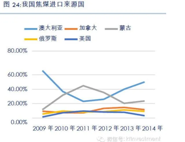 我国炼焦煤进口主要来自澳大利亚、蒙古两地。我国从这两个国家进口的炼焦煤在总进口总所占的比重近70%。此外,加拿大、美国、俄罗斯等地也是我国进口炼焦煤的主要来源国。从趋势上看,我国炼焦煤进口越来越倚重澳大利亚,蒙古国由于其运输及国内政策的影响,对我国的出口变化较大。