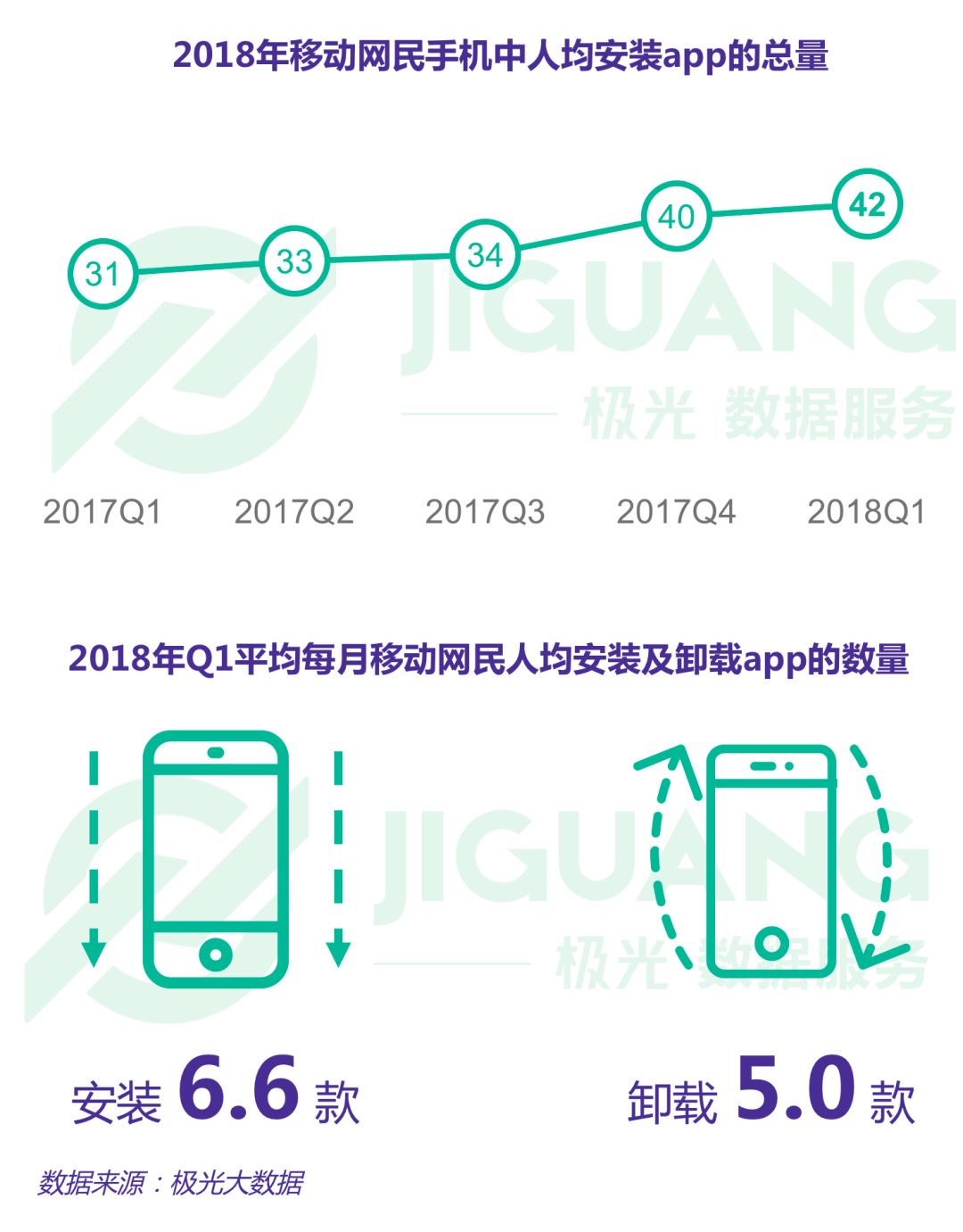 2018年Q1,平均每月中国移动网民人均会新安装app数量为6.6款,同期卸载app数量为5款