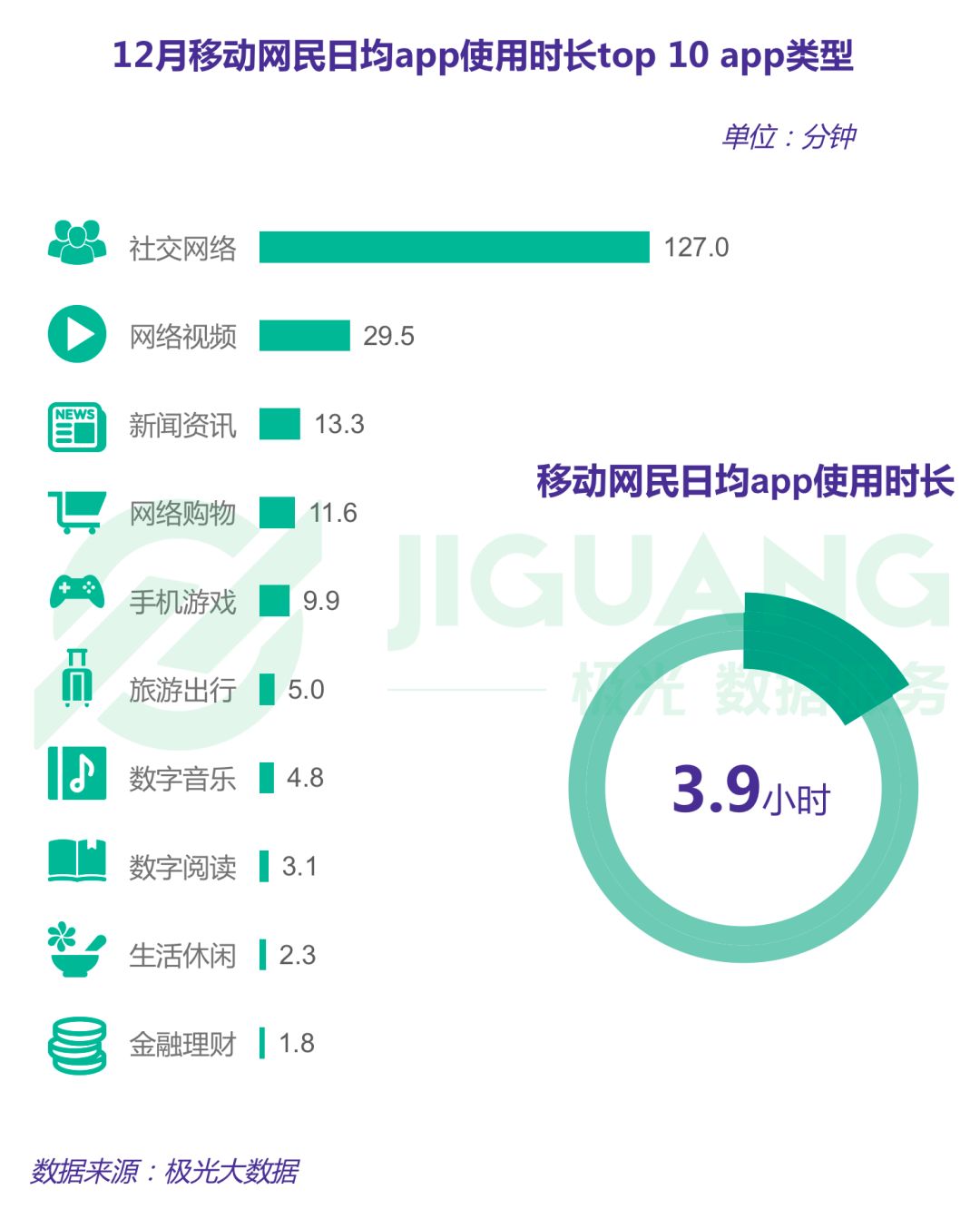 中国移动网民每日平均有3.9小时花费在手机app的使用上;其中,花费在社交网络类app的时长达127分钟