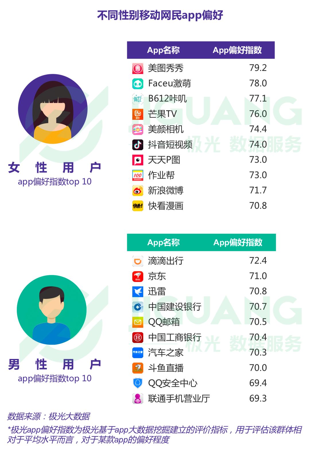 在女性移动网民app偏好指数top 10中,美图秀秀等5款拍照P图app榜上有名,对美图秀秀的偏好指数高达79.2;对在线视频类app芒果TV的偏好指数达76;对短视频类app抖音短视频偏好指数达74
