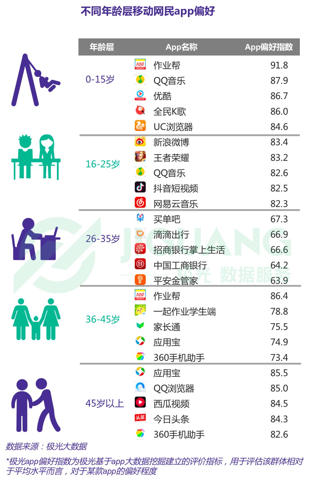 不同年龄层的中国移动网民对app的偏好存在明显差异;0~15岁和36~45岁的移动网民对作业帮均有较高的偏好;16~25岁移动网民对新浪微博偏好指数达83.4;26~35岁偏好指数top 1是买单吧;45岁以上移动网民对应用宝偏好指数达85.5