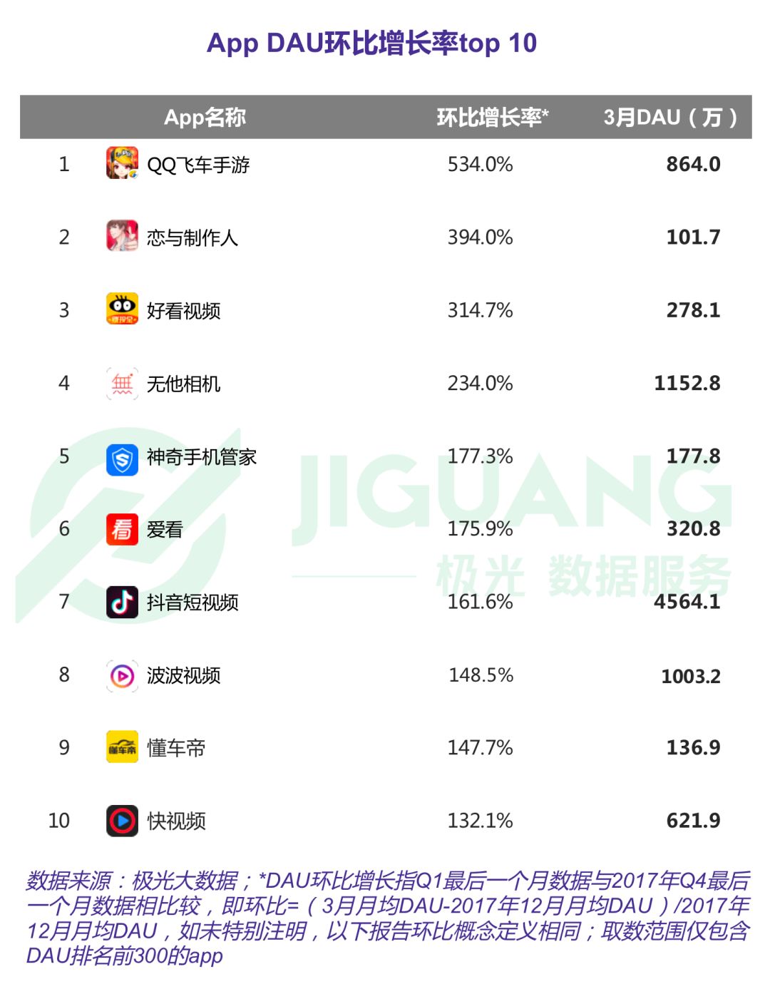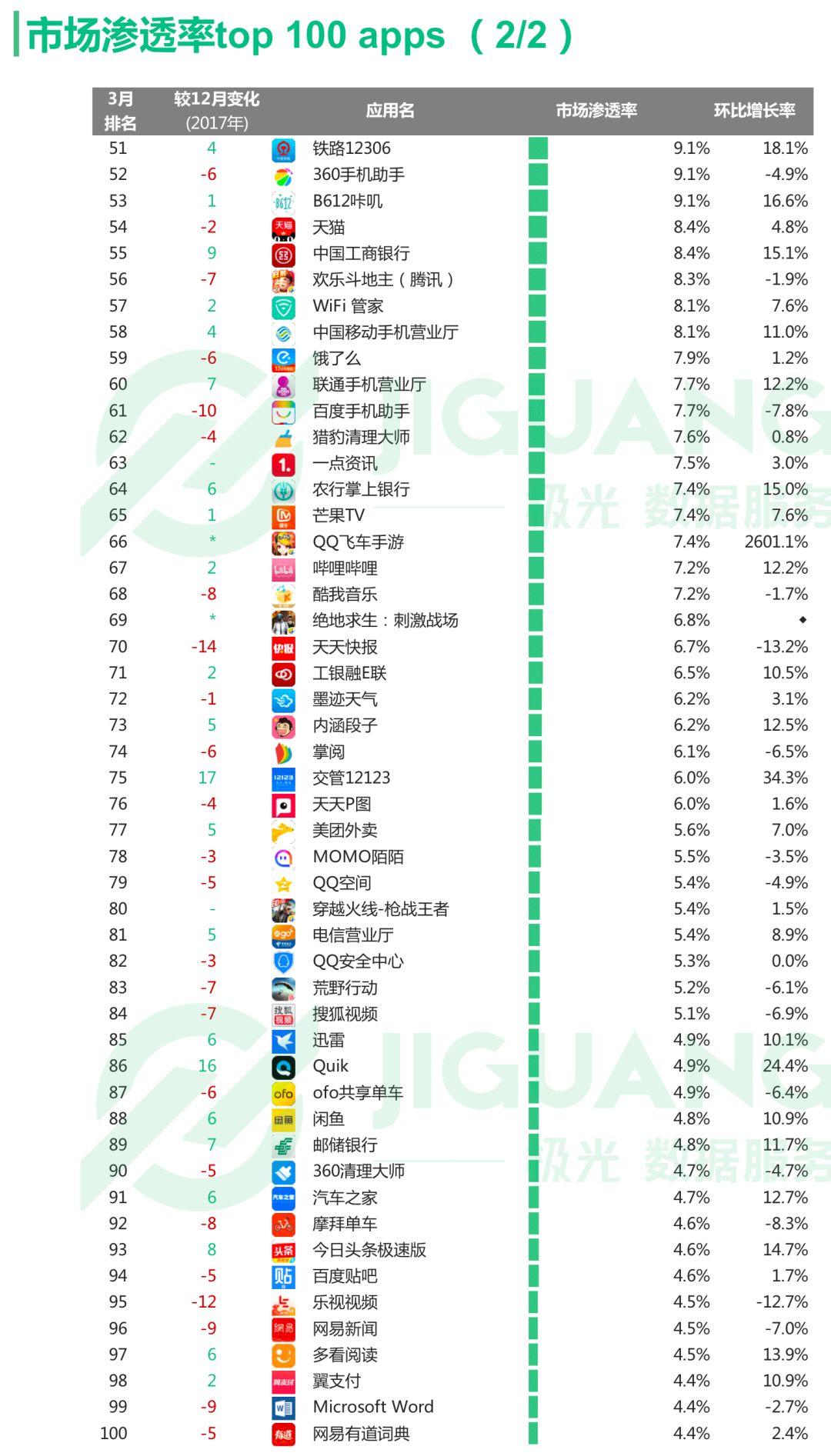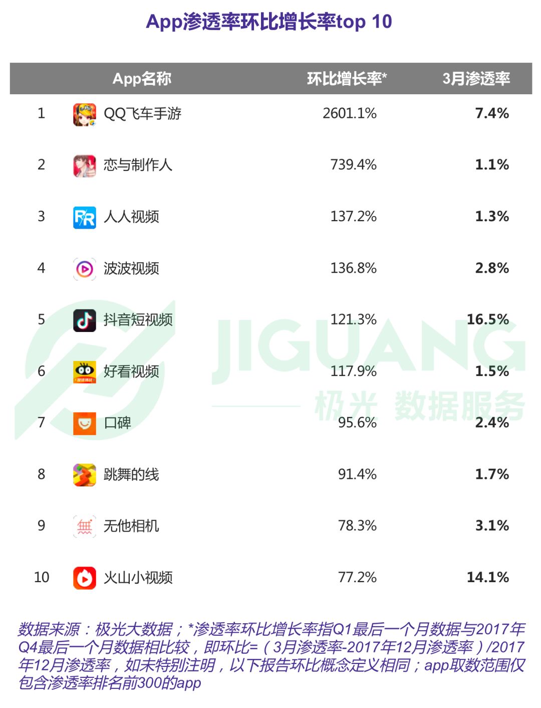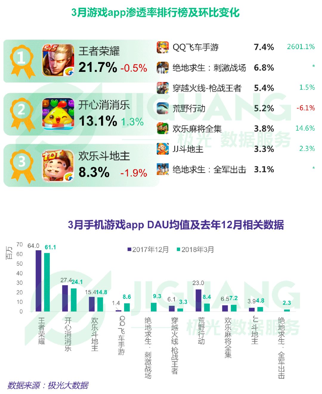 极光大数据显示,3月市场渗透率top 100榜单新晋app有QQ飞车手游(66名,7.4%)、绝地求生:刺激战场(69名,6.8%)