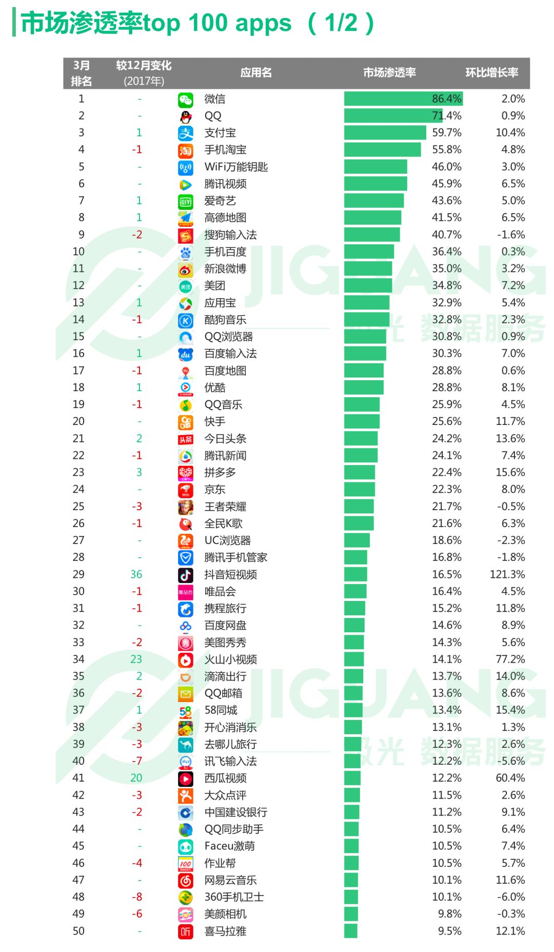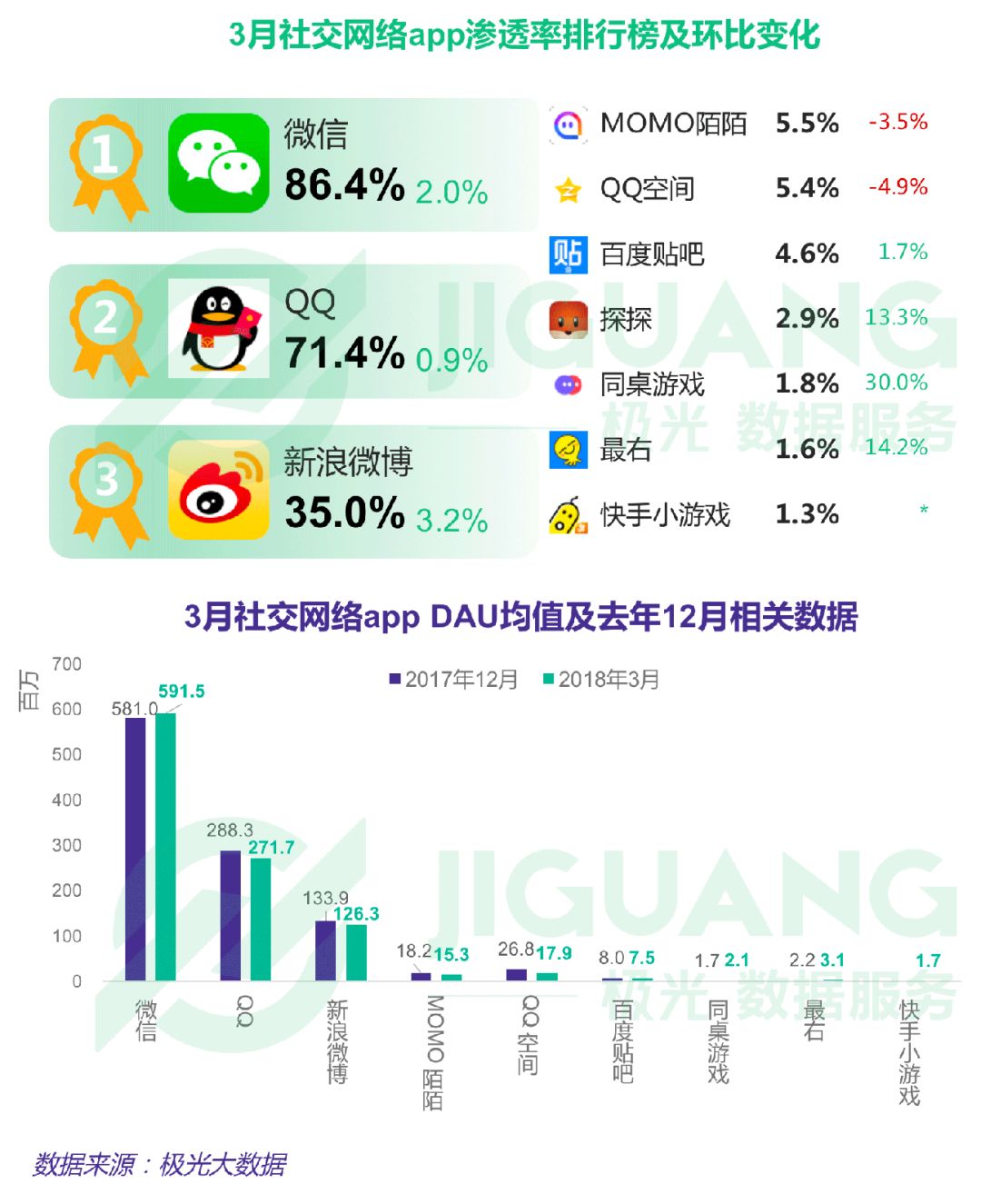 社交网络霸主微信3月渗透率达86.4%,相比12月增长2.0%,3月DAU均值达5.9亿,相比12月增长1千万;QQ 3月渗透率达71.4%,相比12月增长0.9%;新浪微博渗透率达35%,相比12月增长3.2%;值得注意的是,游戏社交类app同桌游戏环比增长30%,在3月社交网络app渗透率top 10中增长最快