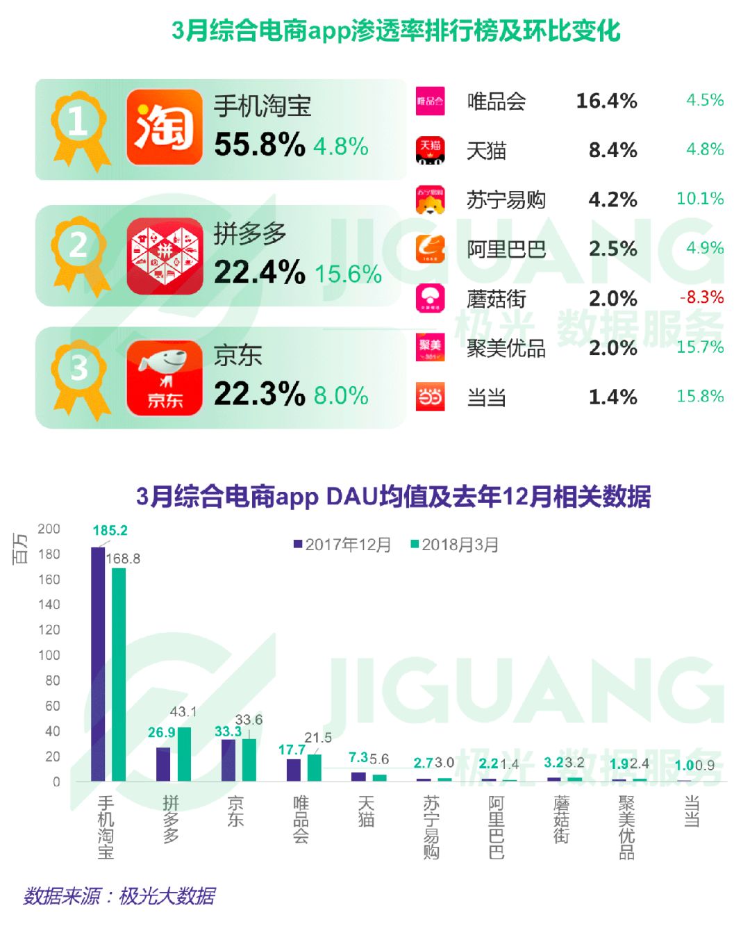 相比12月份,3月渗透率top 10的综合电商app的渗透率呈普涨趋势,过年过节买买买或是主要动力;手机淘宝3月渗透55.8%,相比12月份环比增长4.8%;电商黑马拼多多3月渗透率达22.4%,排名第二超越京东,环比增长15.6%;京东3月渗透率为22.3%,环比增长8%