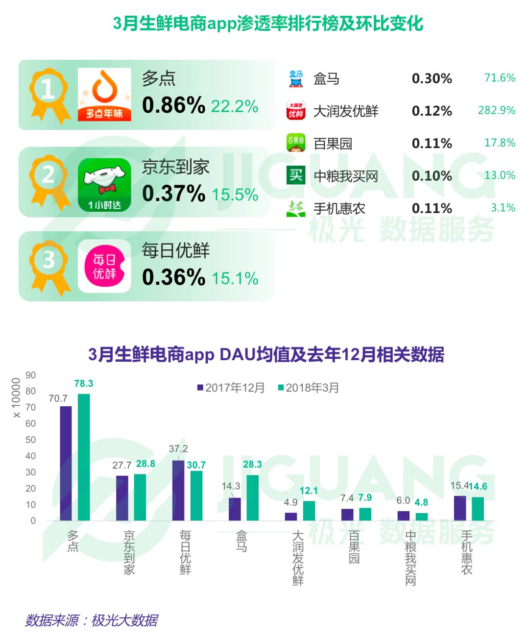 3月渗透率top 10生鲜电商app环比均有所增长;多点3月渗透率达0.86%,环比增长22.2%;京东到家3月渗透率为0.37%;每日优鲜3月渗透率为0.36%;