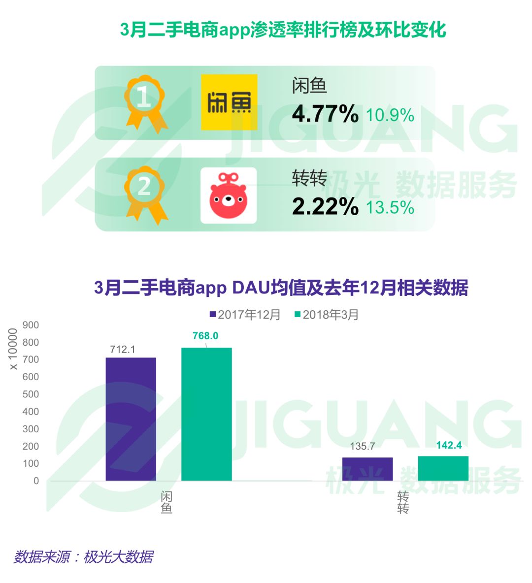 在二手电商app中,头部玩家主要为闲鱼和转转;闲鱼3月渗透率达4.77%,环比增长10.9%;转转3月渗透率达2.22%,环比增长13.5%;DAU方面,闲鱼3月份均值为768万,转转为142.4万