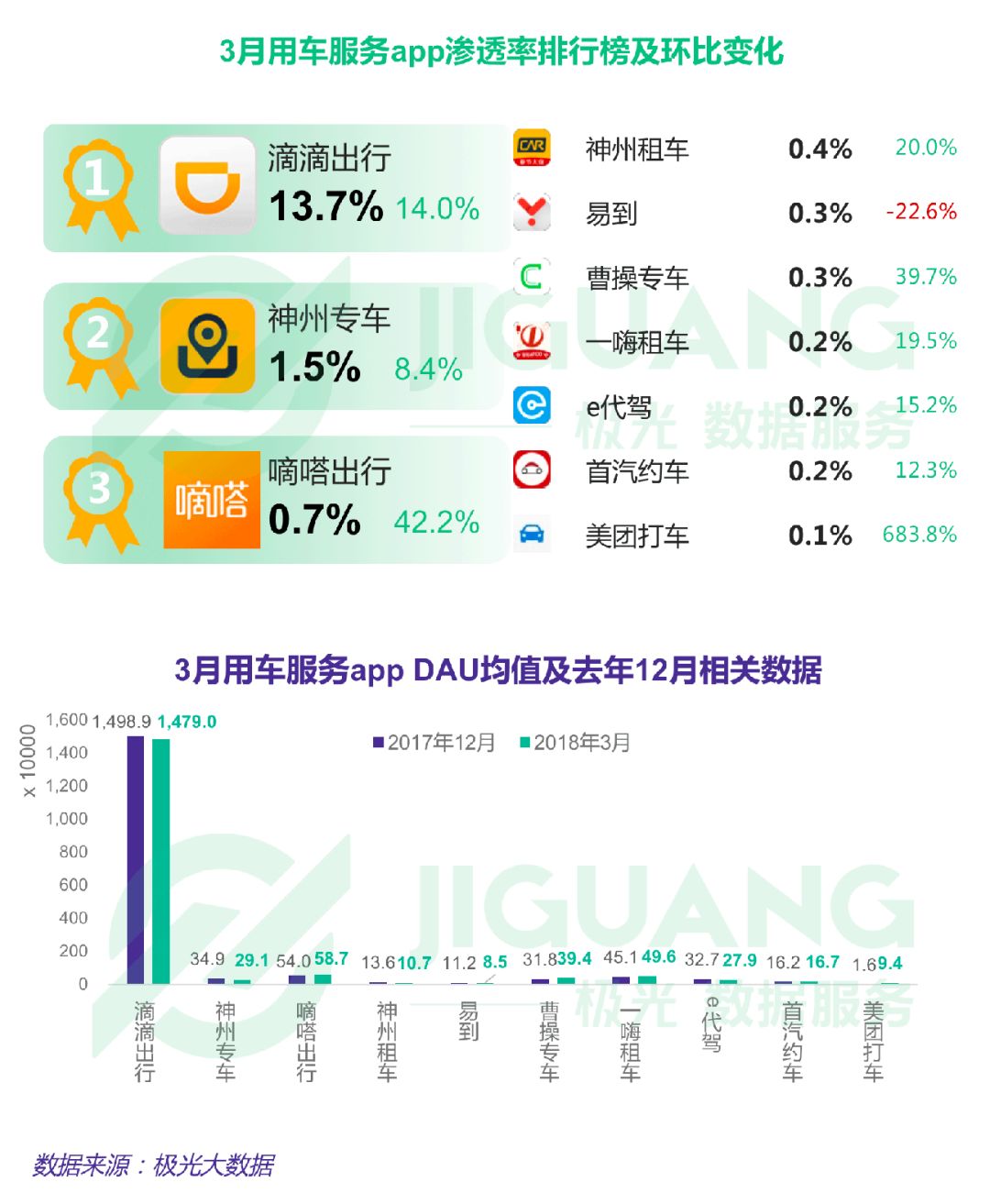 滴滴出行是用车服务领域的头号玩家,3月渗透率达13.7%,环比增长14%;近期品牌升级并推出网约出租车服务的嘀嗒出行渗透率为0.7%,环比增长42.2%,出行市场中小玩家的局部竞争力不容小觑