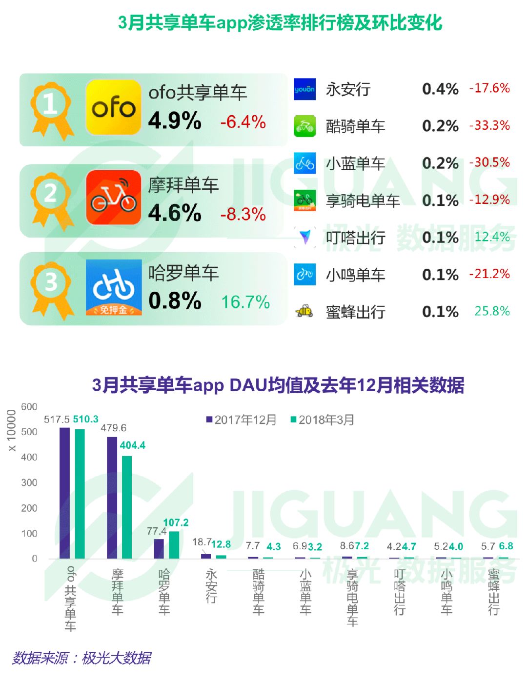 ofo与摩拜单车的渗透率环比增长双双下滑