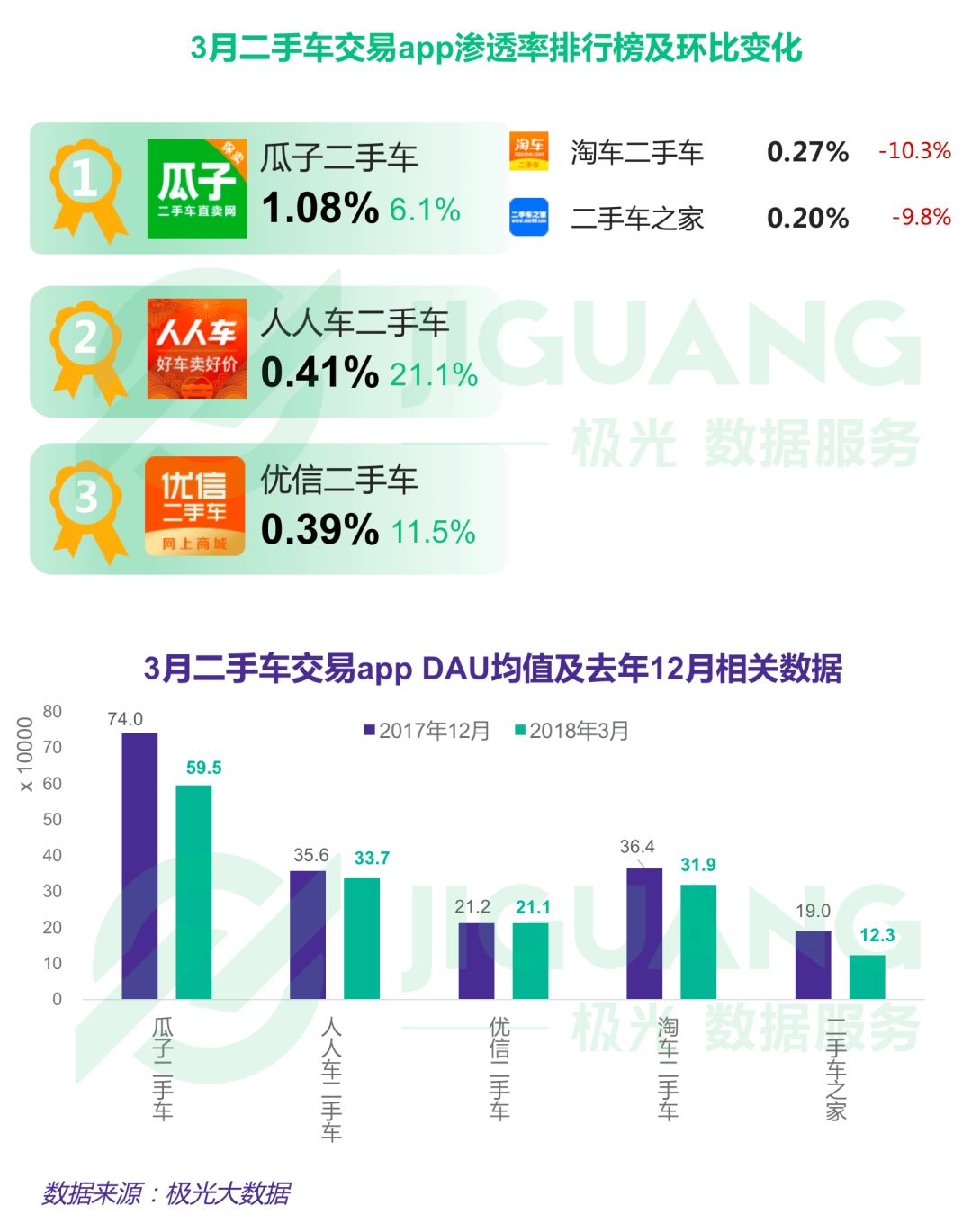 二手车交易平台中,瓜子二手车以1.08%的渗透率位列第一,3月DAU均值达59.5万;与滴滴合作的人人车二手车渗透率为0.41%,环比增长21.1%,3月DAU均值达33.7万