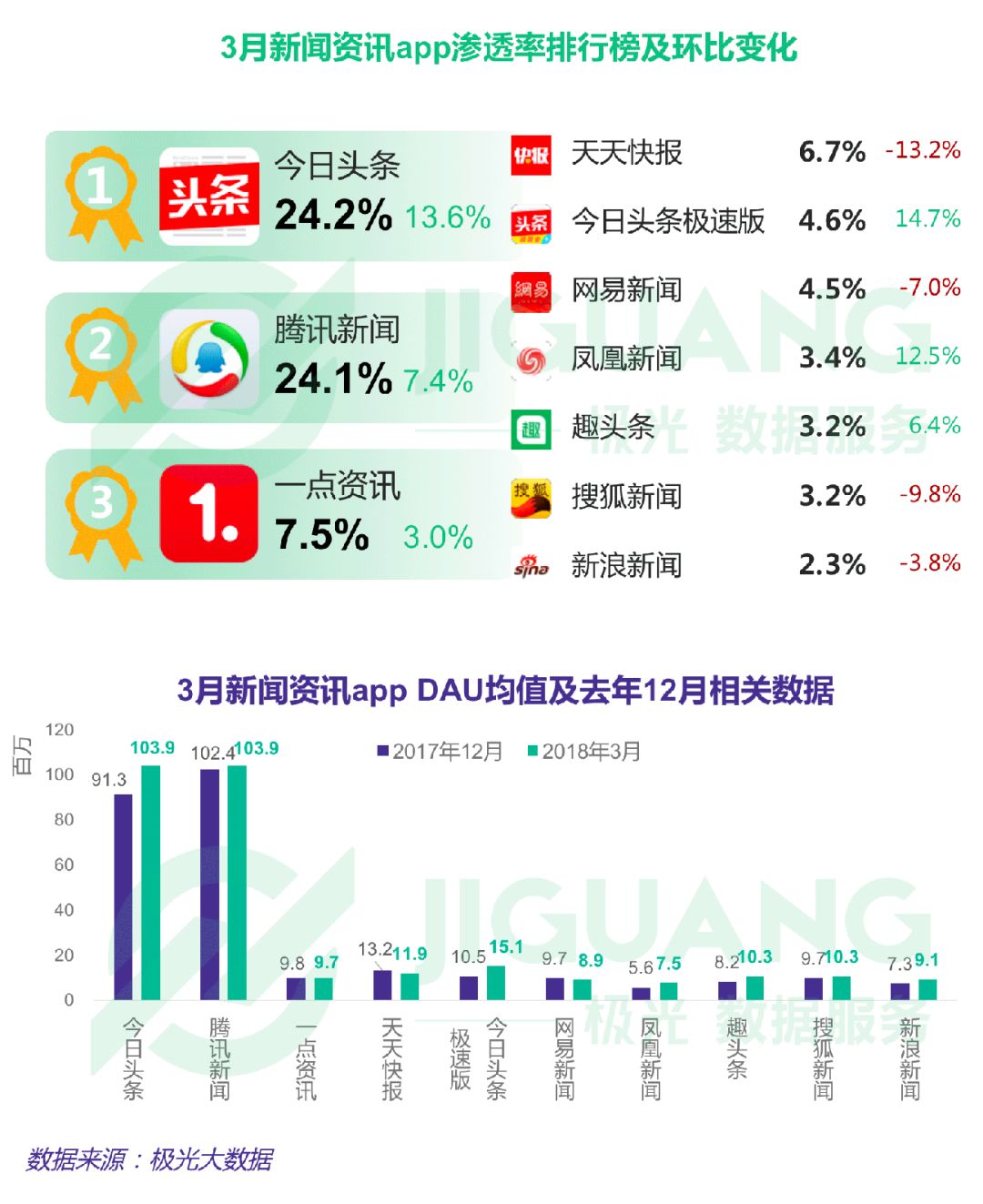 在新闻资讯领域,今日头条以24.2%的渗透率位列第一;腾讯新闻以24.1%的渗透率位列第二;一点资讯以7.5%的渗透率位列第三;获得腾讯投资的趣头条3月渗透率达3.2%