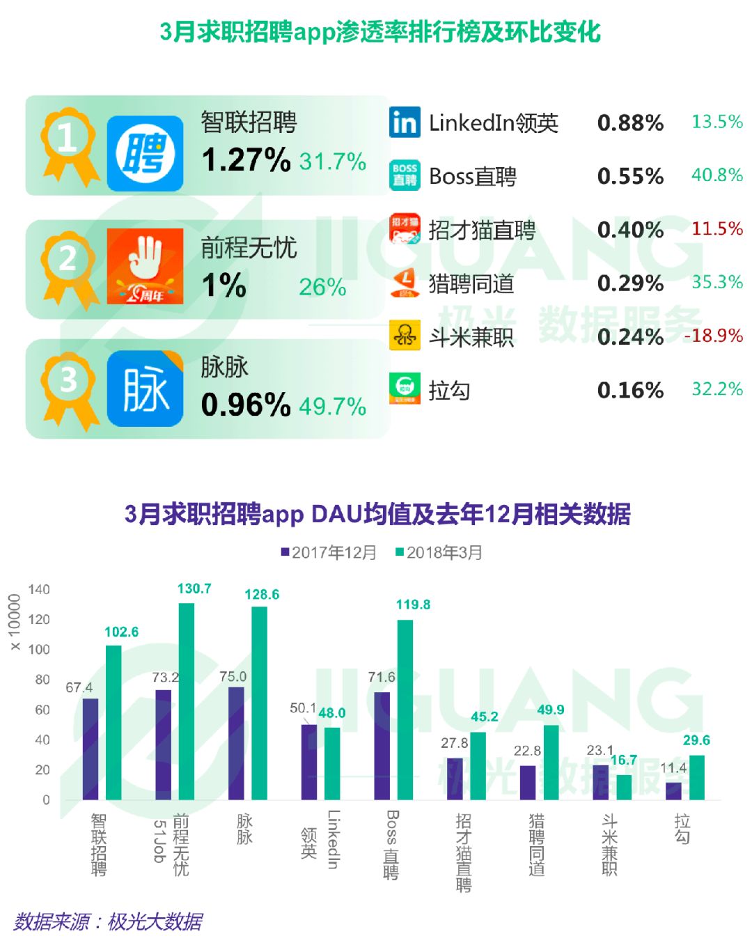 金三银四的招聘季中,多数求职招聘app渗透率和DAU均值环比均有所增长;智联招聘、前程无忧、脉脉渗透率排名前三,3月渗透率分别为1.27%、1%、0.96%,DAU均值分别为102.6万、130.7万和128.6万