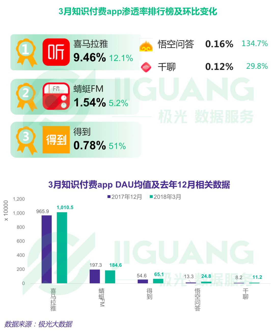 知识付费独立app领域,喜马拉雅3月渗透率达 9.46%,3月DAU均值达1010.5万;蜻蜓FM 3月渗透率达1.54%,DAU均值达184.6万;得到3月渗透率为0.78%,环比增长达51%,DAU均值为65.1万;头条系问答类app悟空问答渗透率为0.16%,环比增长达134.7%