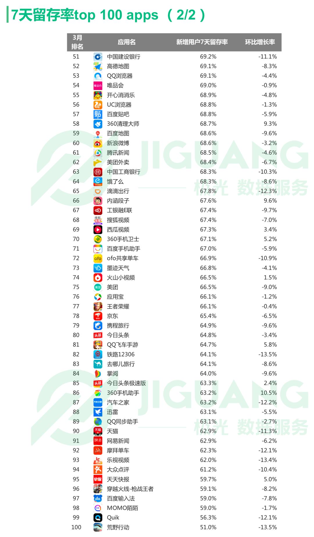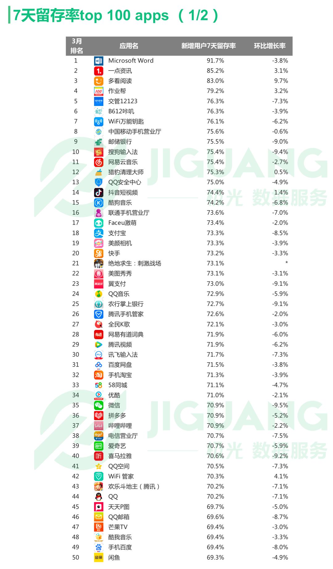 极光大数据显示,3月7天留存率top 100榜单前三甲是Microsoft Word(91.7%)、 一点资讯(85.2%) 、多看阅读(83.0%)