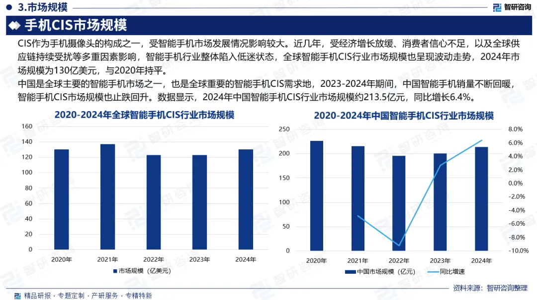 中国市场规模:中国是全球主要的智能手机市场之一,也是全球重要的智能手机CIS需求地,2023-2024年期间,中国智能手机销量不断回暖,智能手机CIS市场规模也止跌回升。数据显示,2024年中国智能手机CIS行业市场规模约213.5亿元,同比增长6.4%。