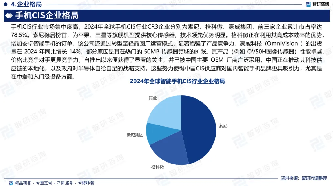 企业格局:手机CIS行业市场集中度高,2024年全球手机CIS行业CR3企业分别为索尼、格科微、豪威集团,前三家企业累计市占率达78.5%。