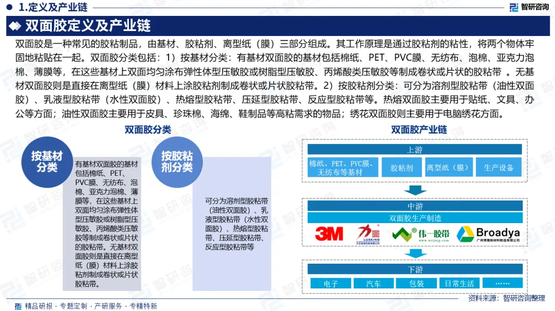 产业链:上游为原材料及生产设备,原材料包括棉纸、PET、PVC膜、无纺布等基材,胶粘剂,离型纸(膜),中游为双面胶生产制造,双面胶制造壁垒相对较低,市场竞争相对激烈。下游为双面胶应用场景,涵盖电子、汽车、家居、日常生活等场景。