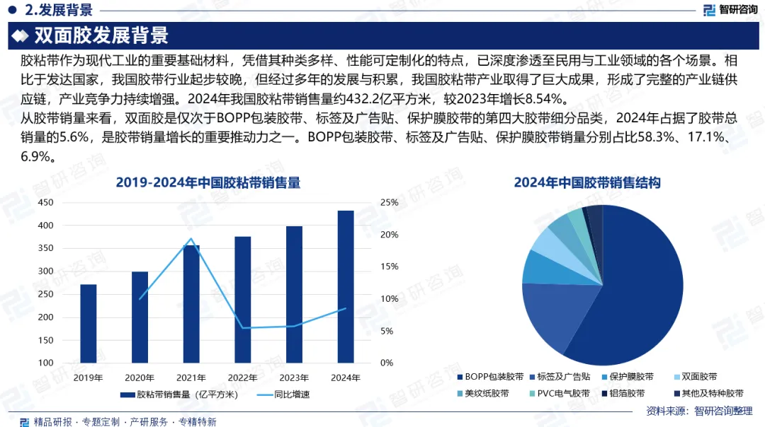 双面胶是一种常见的胶粘制品,由基材、胶粘剂、离型纸(膜)三部分组成。其工作原理是通过胶粘剂的粘性,将两个物体牢固地粘贴在一起。从双面胶产业链来看,上游为原材料及生产设备,原材料包括棉纸、PET、PVC膜、无纺布等基材,胶粘剂,离型纸(膜),中游为双面胶生产制造,双面胶制造壁垒相对较低,市场竞争相对激烈。下游为双面胶应用场景,双面胶的适用场景非常广泛,在电子市场,可用于粘贴手机、电脑、数码相机等设备的零部件;在汽车市场,常用于汽车外观装饰条、零部件、车标等的固定;在家居市场,挂钩、家具、玩具、工艺品等的粘贴都离不开它。在日常生活、学习中,双面胶的身影也十分常见。双面胶是胶粘带的重要组成部分,在传统应用领域中展现出多功能的粘接与密封特性,广泛应用于工业制造、建筑、包装及日常生活等领域。近年来,随着5G通信、新能源汽车等尖端技术的不断突破,强势拉动双面胶带出现新的市场空间。行业销量由2020年的17.7亿平方米增长至2024年的24亿平方米,实现年复合增长率7.9%。双面胶是仅次于BOPP包装胶带、标签及广告贴、保护膜胶带的第四大胶带细分品类,2024年占据了胶带总销量的5.6%,是胶带销量增长的重要推动力之一。双面胶销量不断增长拉动销售额持续扩张,据中国胶粘剂和胶粘带工业协会数据,2024年中国双面胶销售额成功突破100亿元,达101亿元,较2023年同比增长9.8%。2020-2024年期间,中国双面胶销售均价在3.6-4.6元/平方米之间波动,2021年售价最高达4.59元/平方米,随后价格稳定在4.2元/平方米左右,2024年价格为4.21元/平方米,较2023年小幅增长0.03元/平方米。未来,双面胶行业将呈现需求增长、技术进步、集中度提升的发展趋势。