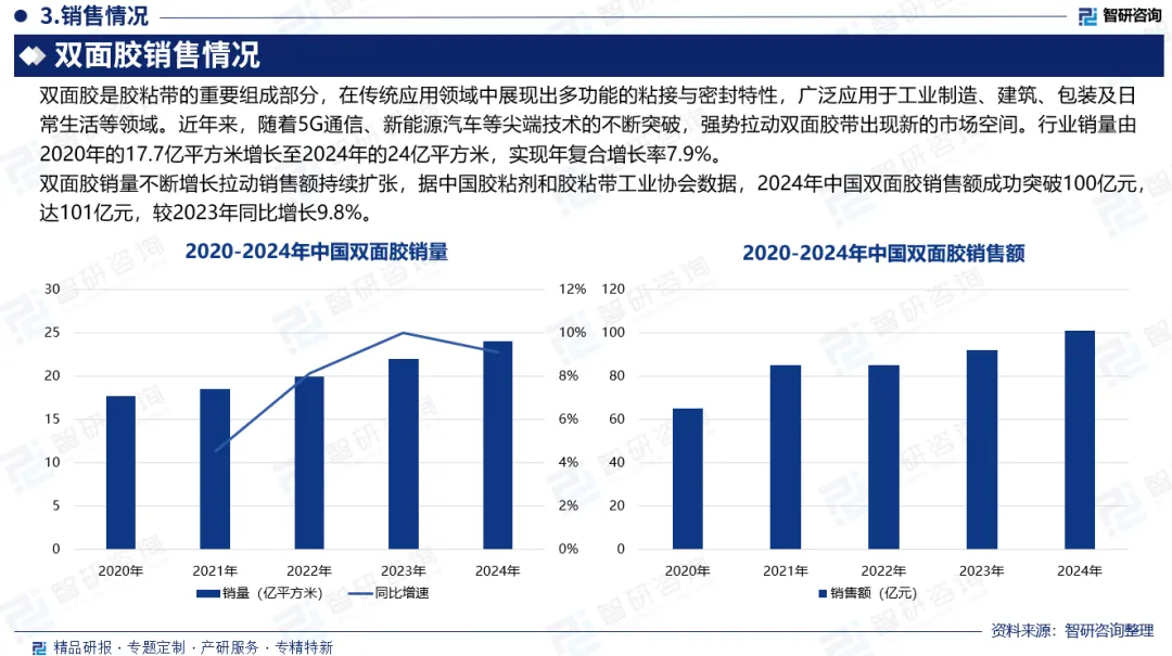 市场销量:双面胶在传统应用领域中展现出多功能的粘接与密封特性,广泛应用于工业制造、建筑、包装及日常生活等领域。近年来,随着5G通信、新能源汽车等尖端技术的不断突破,强势拉动双面胶带出现新的市场空间。行业销量由2020年的17.7亿平方米增长至2024年的24亿平方米,实现年复合增长率7.9%。
