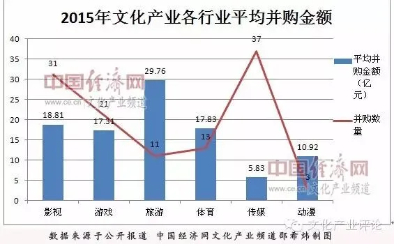 据了解,2014年并购事件主要发生在影视传媒、游戏动漫、移动互联网、教育培训和旅游户外5个行业板块,其中影视、新媒体板块是并购的热点领域。与之相类似,2015年,影视、游戏等行业并购仍然火爆,体育、旅游等产业异军突起。据不完全统计,截止2015年12月25日,影视行业发生31起并购行为,除4起未披露金额外,并购总额高达507.78亿元,位居各行业第一;游戏行业发生并购行为21起,除2起未披露金额外,并购总额达到328.9亿元,位列各行业第二;旅游行业发生11起并购事件,除3起未披露金额外,并购总额为238.06亿元;体育行业发生13起并购,除了1起未披露金额以外,并购总额达到213.93亿元;动漫行业并购事件仅3件,1起未披露金额,其他两起并购金额为21.04亿元;传媒行业发生37起并购案例,除6起未披露金额以外,并购总额达到180.77亿元。