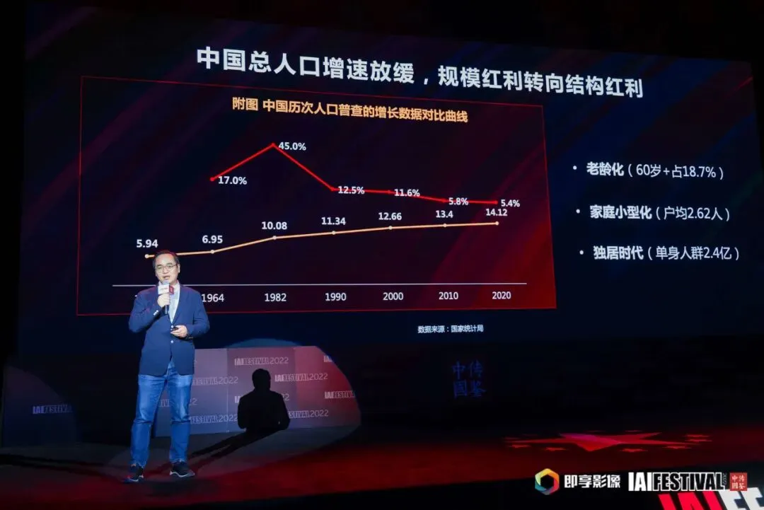 二是家庭小型化,现在中国户均人口是2.62人,从四世同堂,到三代之家,再到二人世界,家越来越小,这也让很多产品的包装设计到品牌定位都需要围绕家庭形态做出改变。