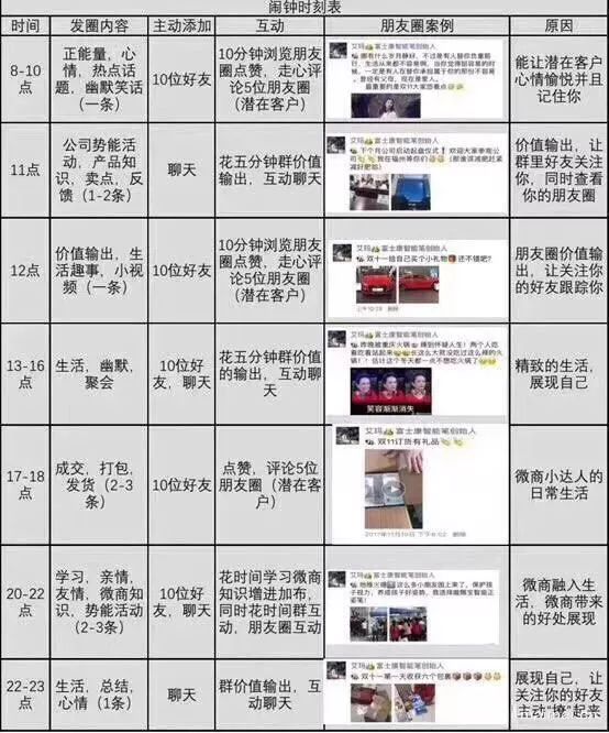 可以看到,微商每天的每一个时间段要做的事—互动的内容—执行的原因,甚至每一个细节都是用心设计的。