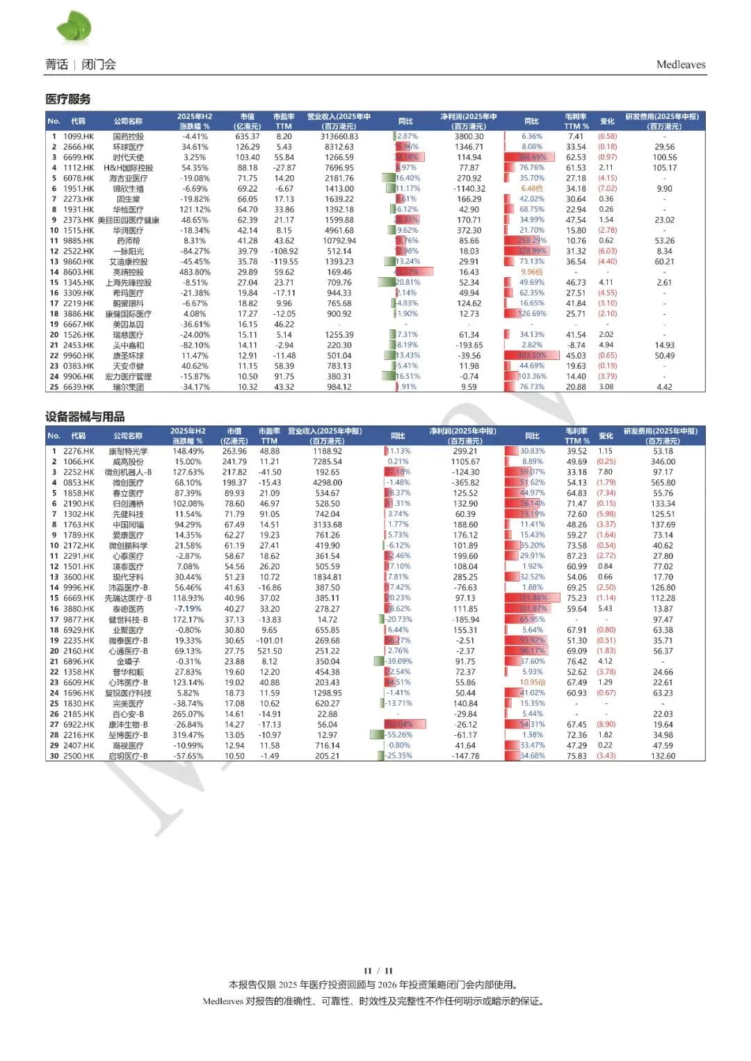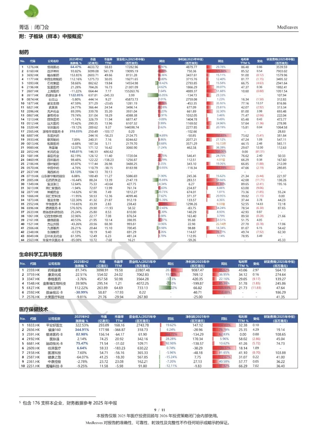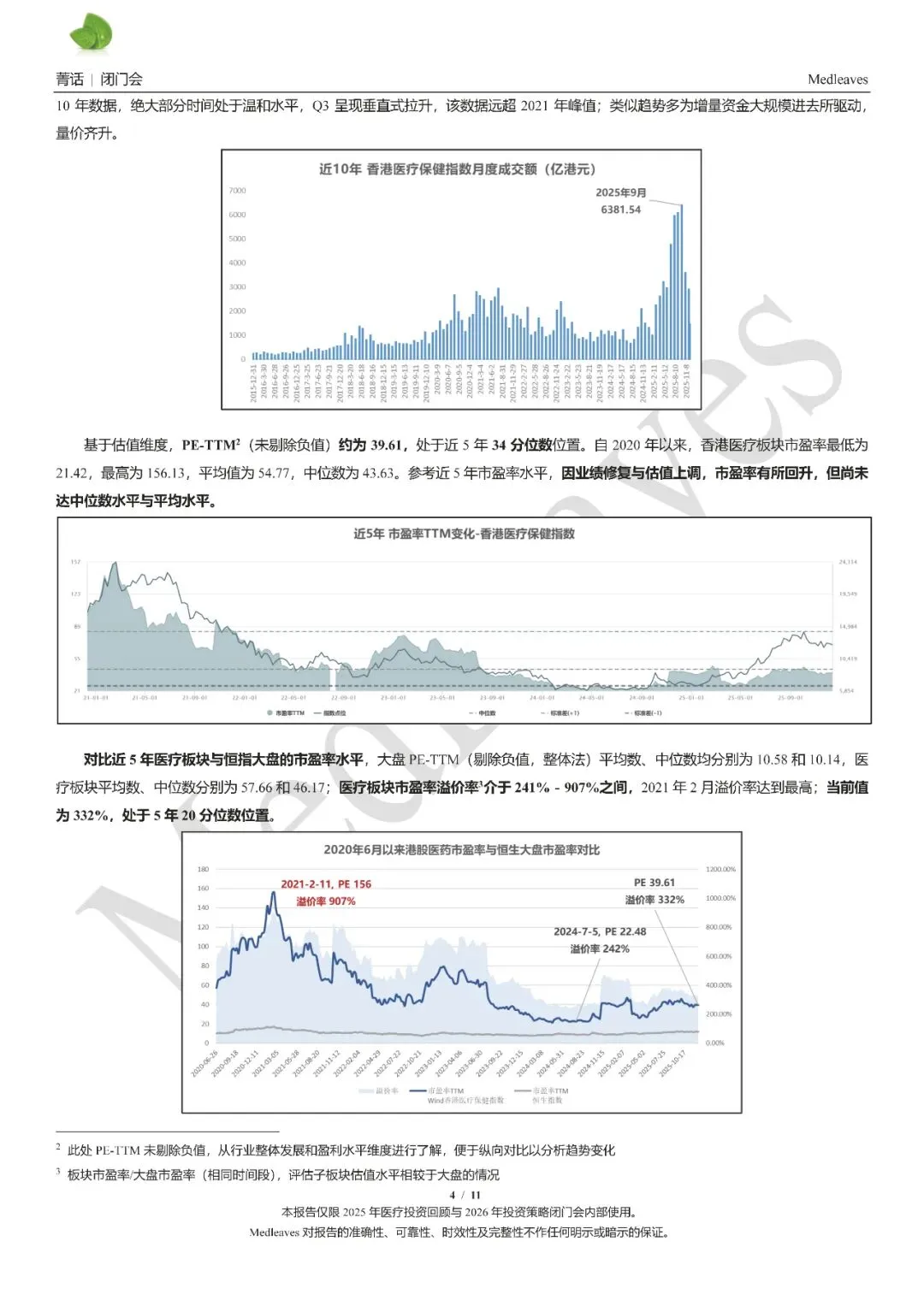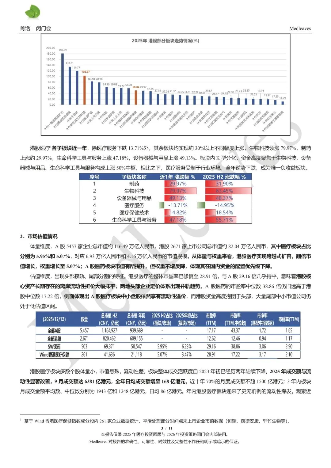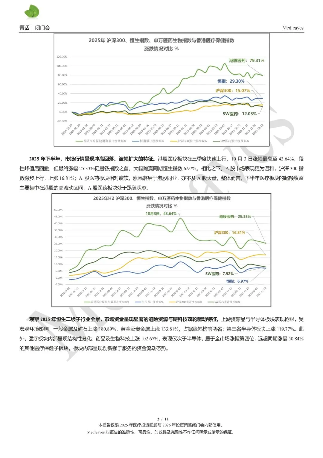 2025年下半年,市场行情呈现冲高回落、波幅扩大的特征。港股医疗板块在三季度快速上行,10月3日涨幅最高至43.64%,段性峰值后回撤,但最终涨幅25.33%仍居各指数之首,大幅跑赢同期恒生指数6.97%。相比之下,A股市场表现更为温和,沪深300指数稳步上行,上涨16.81%;A 股医药板块相对疲软,涨幅落后于港股同业,亦不及A股大盘。整体而言,下半年医疗板块的超额收益主要集中在港股的高波动区间,A股医药板块处于跟随状态。