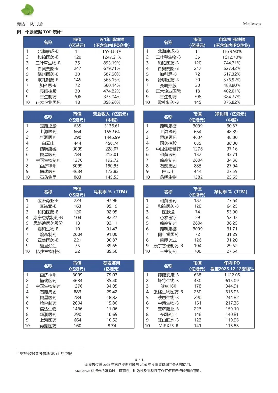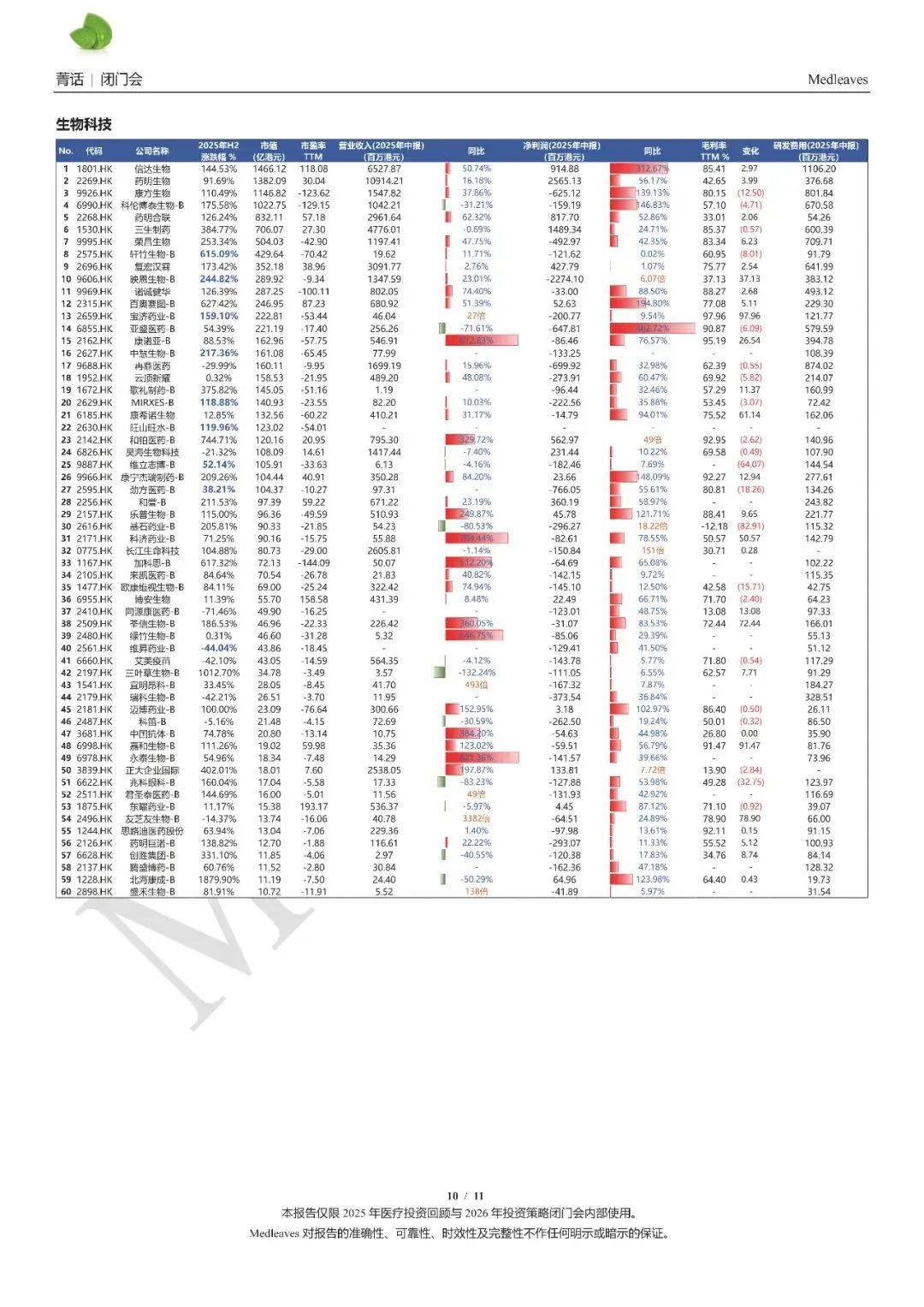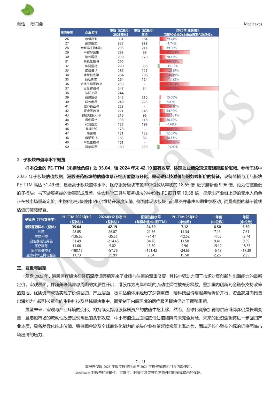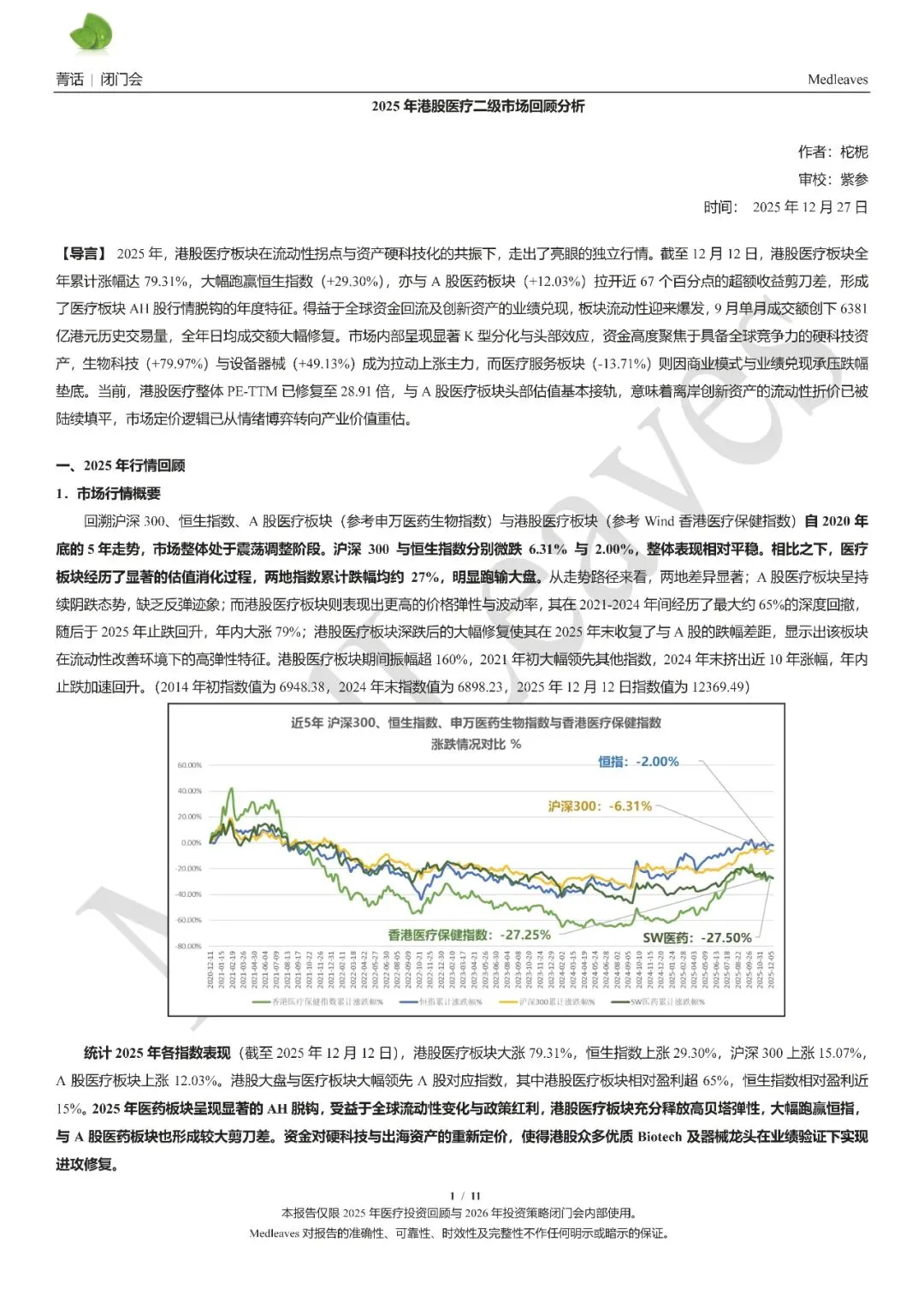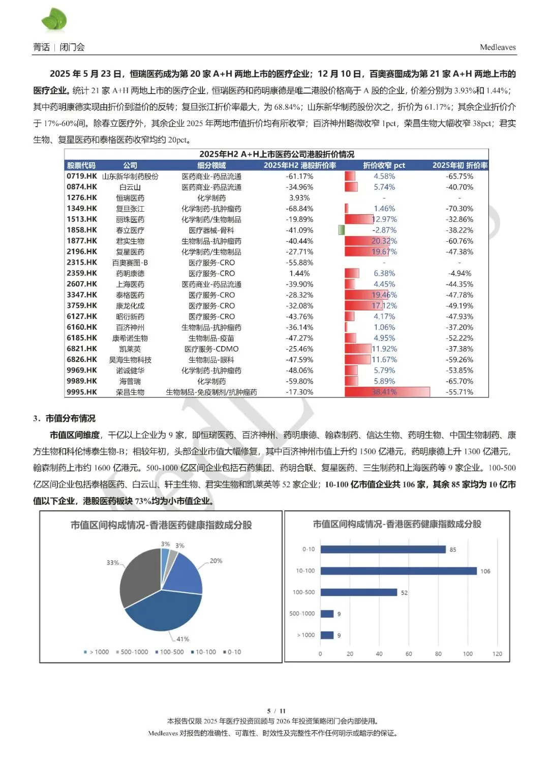 2025年下半年,市场行情呈现冲高回落、波幅扩大的特征。港股医疗板块在三季度快速上行,10月3日涨幅最高至43.64%,段性峰值后回撤,但最终涨幅25.33%仍居各指数之首,大幅跑赢同期恒生指数6.97%。相比之下,A股市场表现更为温和,沪深300指数稳步上行,上涨16.81%;A 股医药板块相对疲软,涨幅落后于港股同业,亦不及A股大盘。整体而言,下半年医疗板块的超额收益主要集中在港股的高波动区间,A股医药板块处于跟随状态。