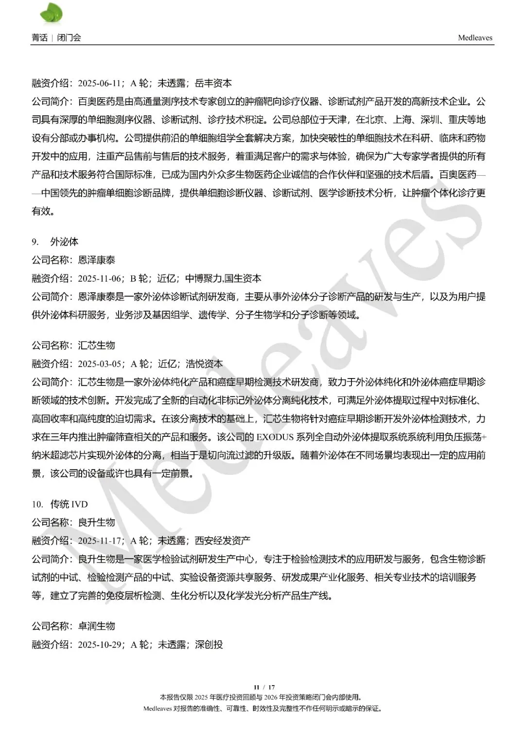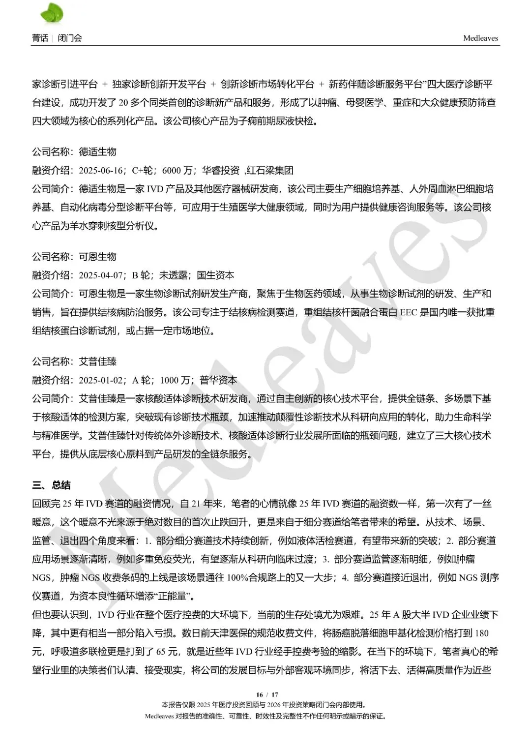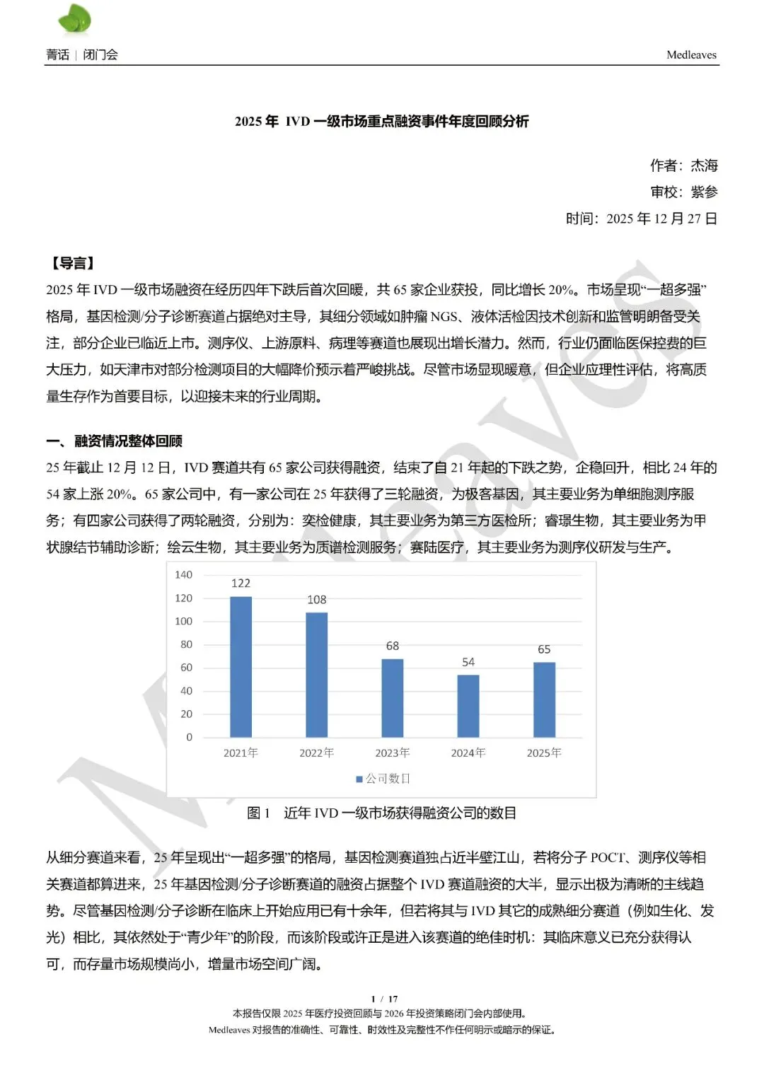 25年截止12月12日,IVD赛道共有65家公司获得融资,结束了自21年起的下跌之势,企稳回升,相比24年的54家上涨20%。65家公司中,有一家公司在25年获得了三轮融资,为极客基因,其主要业务为单细胞测序服务;有四家公司获得了两轮融资,分别为:奕检健康,其主要业务为第三方医检所;睿璟生物,其主要业务为甲状腺结节辅助诊断;绘云生物,其主要业务为质谱检测服务;赛陆医疗,其主要业务为测序仪研发与生产。