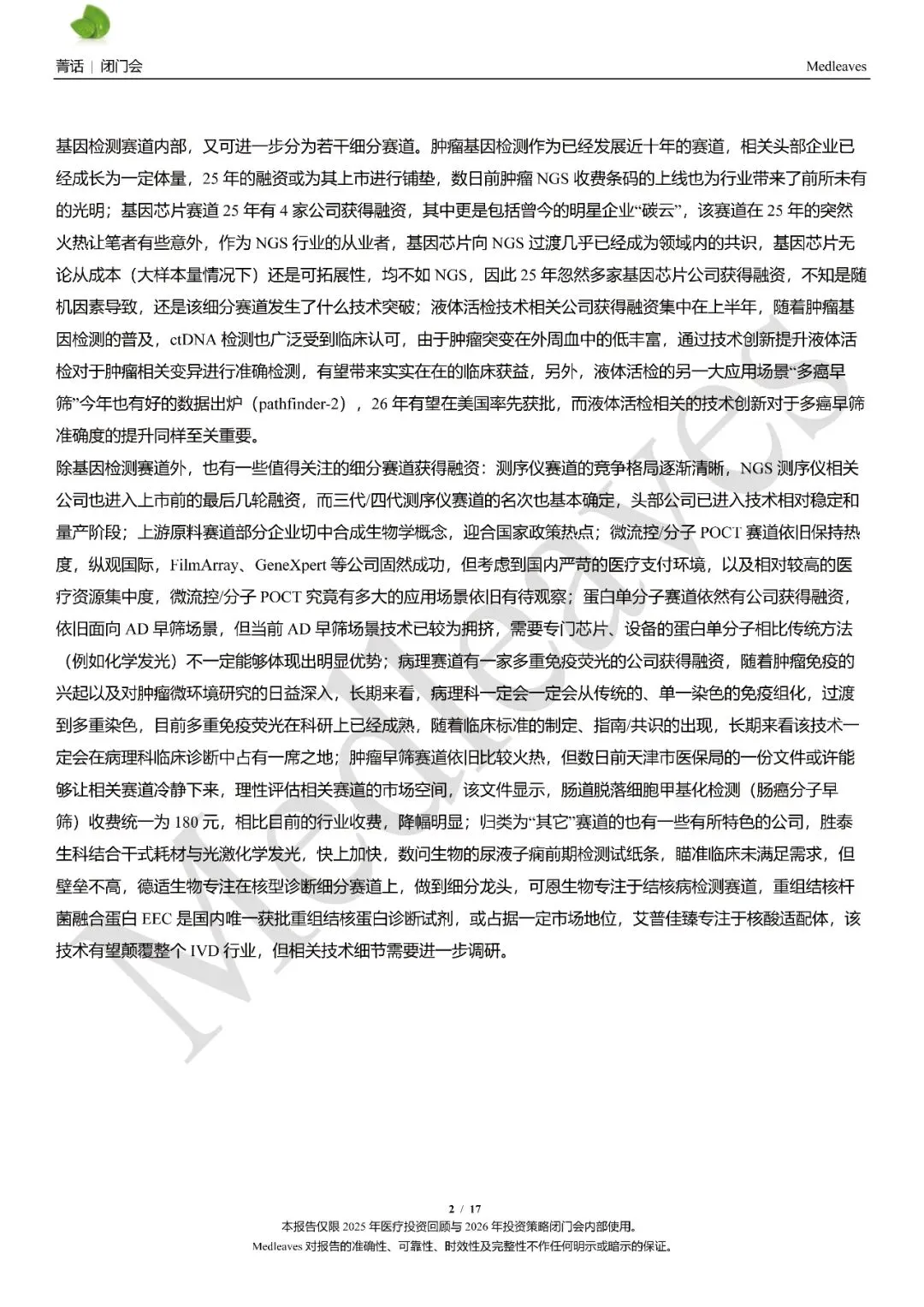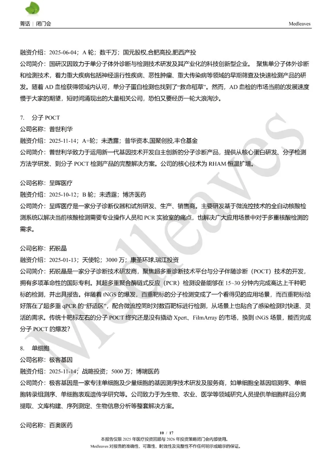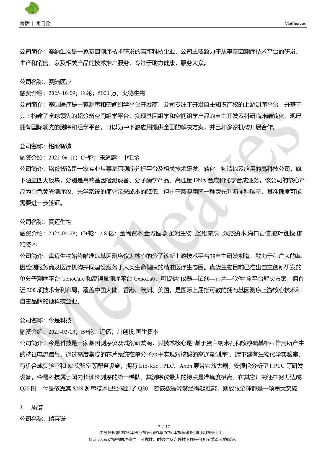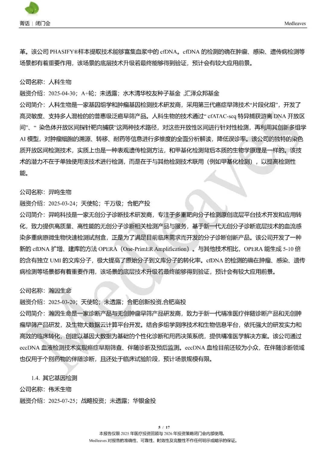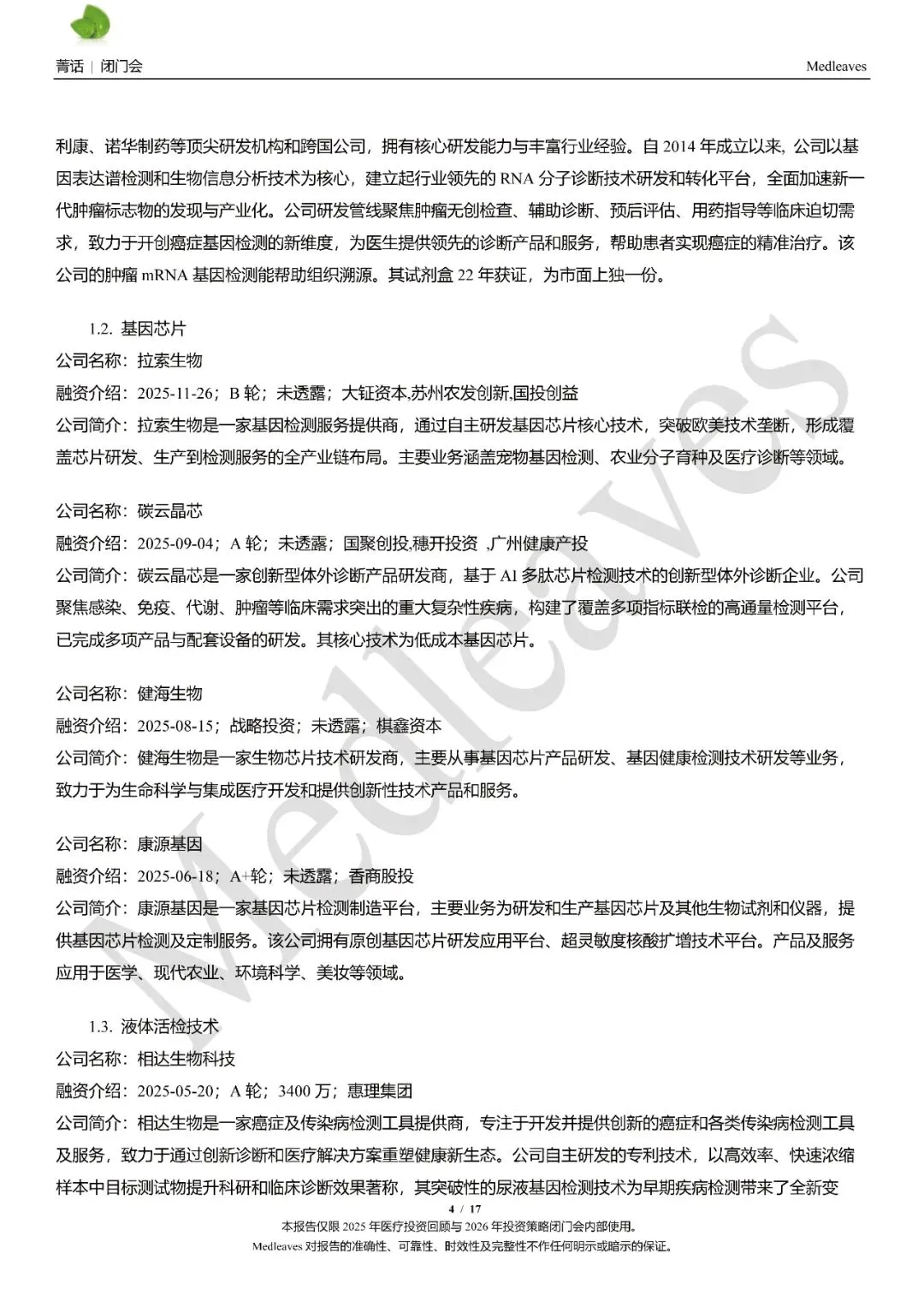 基因检测赛道内部,又可进一步分为若干细分赛道。肿瘤基因检测作为已经发展近十年的赛道,相关头部企业已经成长为一定体量,25年的融资或为其上市进行铺垫,数日前肿瘤NGS收费条码的上线也为行业带来了前所未有的光明;基因芯片赛道25年有4家公司获得融资,其中更是包括曾今的明星企业“碳云”,该赛道在25年的突然火热让笔者有些意外,作为NGS行业的从业者,基因芯片向NGS过渡几乎已经成为领域内的共识,基因芯片无论从成本(大样本量情况下)还是可拓展性,均不如NGS,因此25年忽然多家基因芯片公司获得融资,不知是随机因素导致,还是该细分赛道发生了什么技术突破;液体活检技术相关公司获得融资集中在上半年,随着肿瘤基因检测的普及,ctDNA检测也广泛受到临床认可,由于肿瘤突变在外周血中的低丰富,通过技术创新提升液体活检对于肿瘤相关变异进行准确检测,有望带来实实在在的临床获益,另外,液体活检的另一大应用场景“多癌早筛”今年也有好的数据出炉(pathfinder-2),26年有望在美国率先获批,而液体活检相关的技术创新对于多癌早筛准确度的提升同样至关重要。