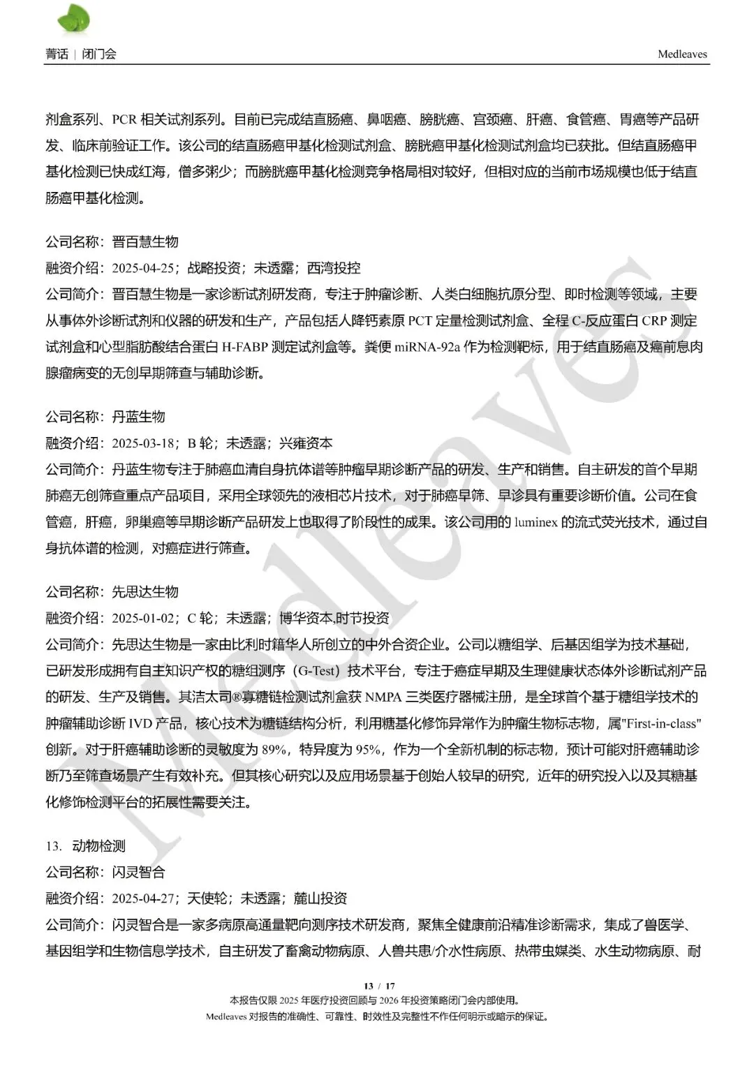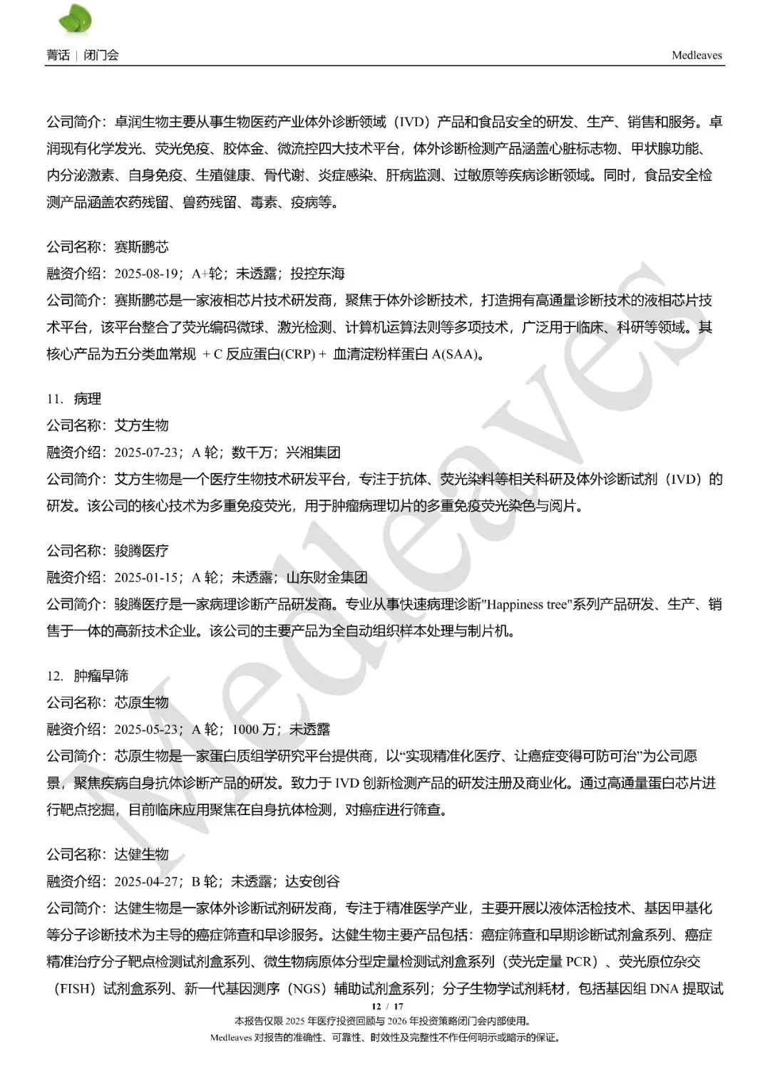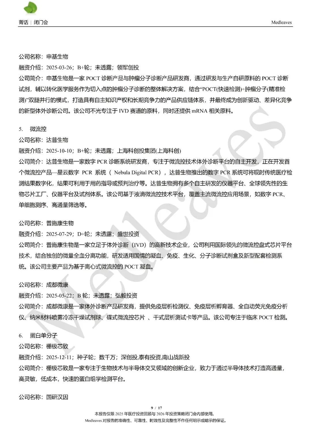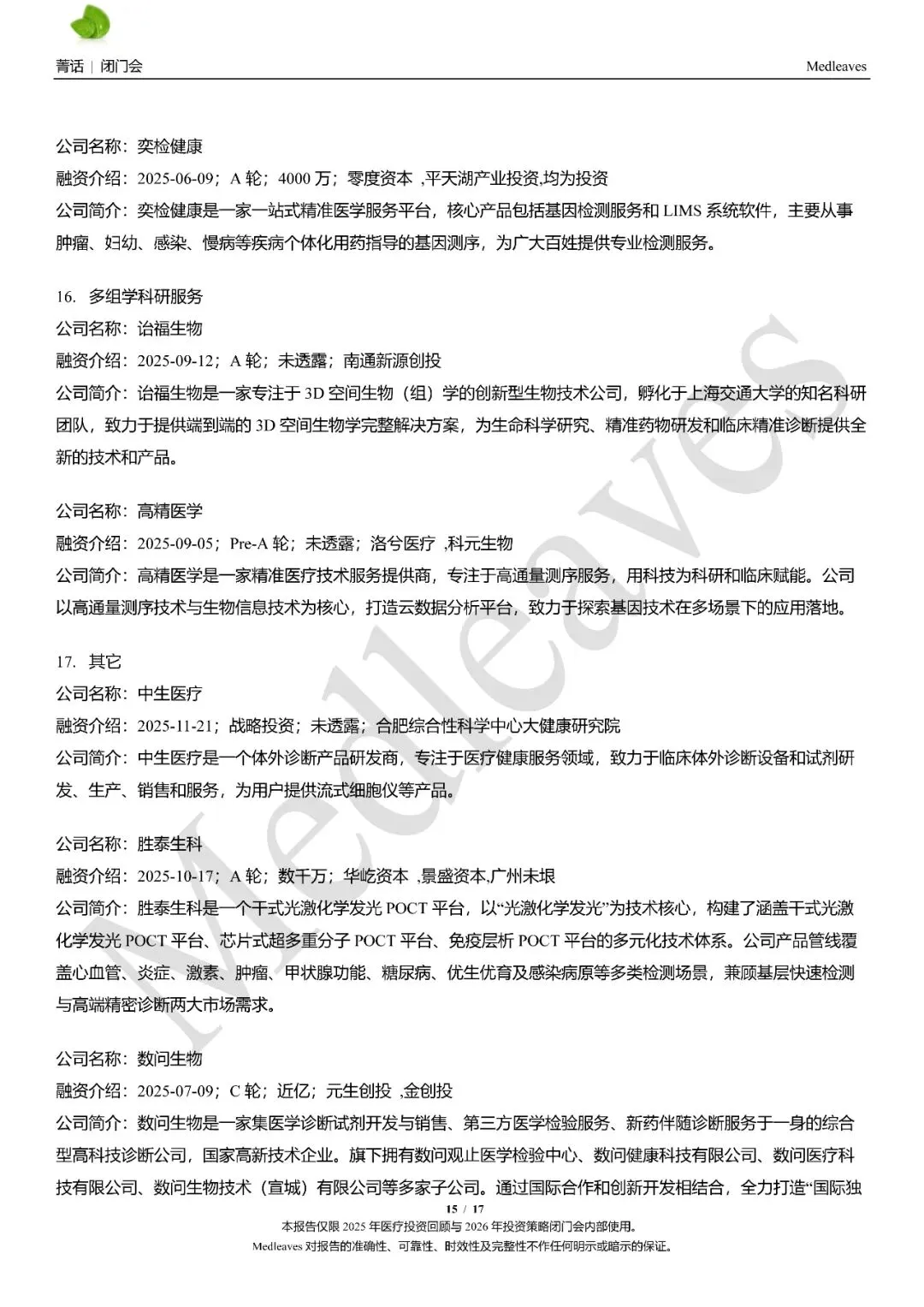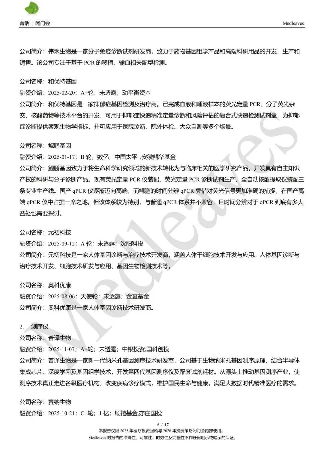 基因检测赛道内部,又可进一步分为若干细分赛道。肿瘤基因检测作为已经发展近十年的赛道,相关头部企业已经成长为一定体量,25年的融资或为其上市进行铺垫,数日前肿瘤NGS收费条码的上线也为行业带来了前所未有的光明;基因芯片赛道25年有4家公司获得融资,其中更是包括曾今的明星企业“碳云”,该赛道在25年的突然火热让笔者有些意外,作为NGS行业的从业者,基因芯片向NGS过渡几乎已经成为领域内的共识,基因芯片无论从成本(大样本量情况下)还是可拓展性,均不如NGS,因此25年忽然多家基因芯片公司获得融资,不知是随机因素导致,还是该细分赛道发生了什么技术突破;液体活检技术相关公司获得融资集中在上半年,随着肿瘤基因检测的普及,ctDNA检测也广泛受到临床认可,由于肿瘤突变在外周血中的低丰富,通过技术创新提升液体活检对于肿瘤相关变异进行准确检测,有望带来实实在在的临床获益,另外,液体活检的另一大应用场景“多癌早筛”今年也有好的数据出炉(pathfinder-2),26年有望在美国率先获批,而液体活检相关的技术创新对于多癌早筛准确度的提升同样至关重要。
