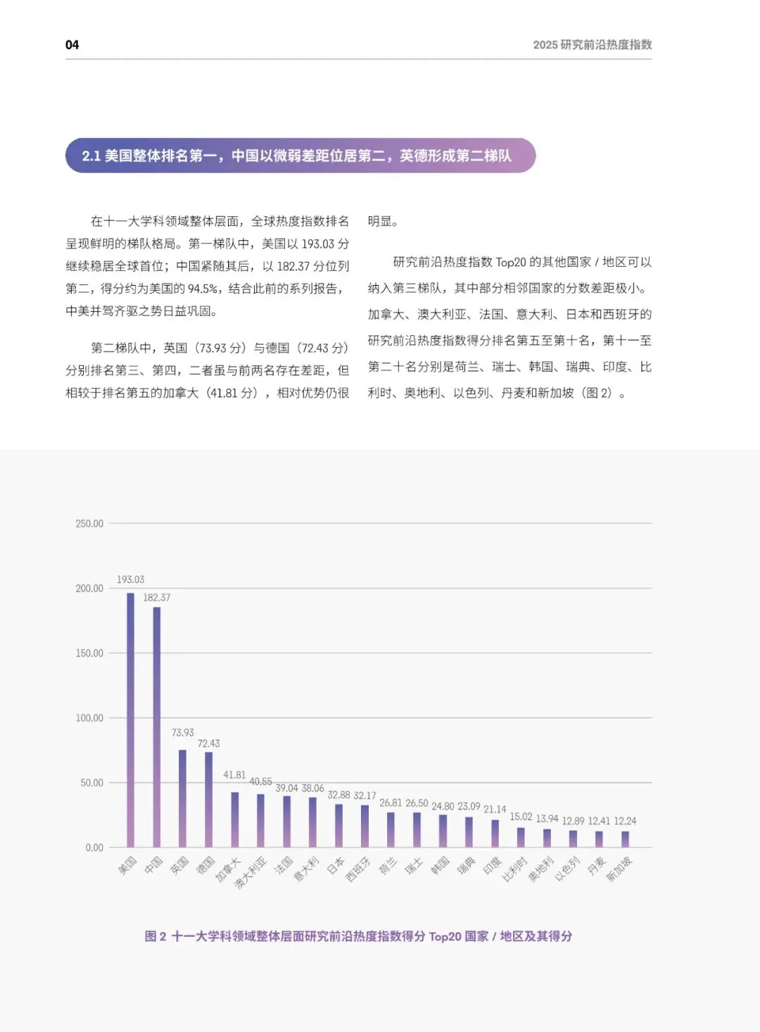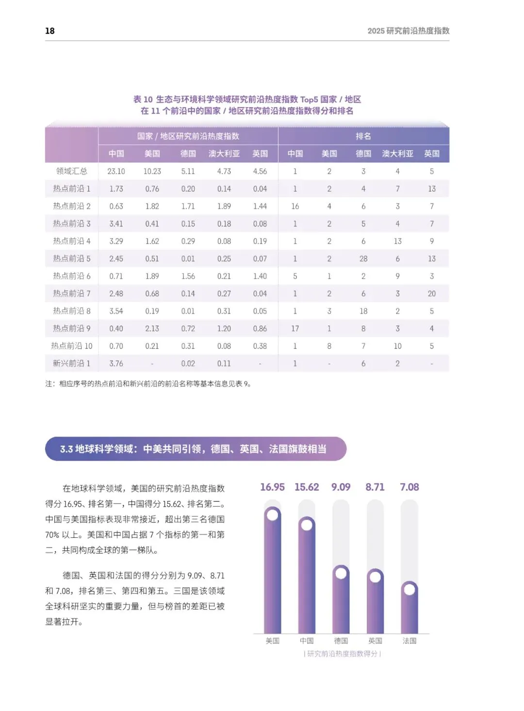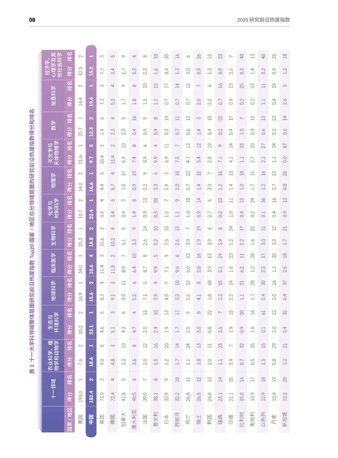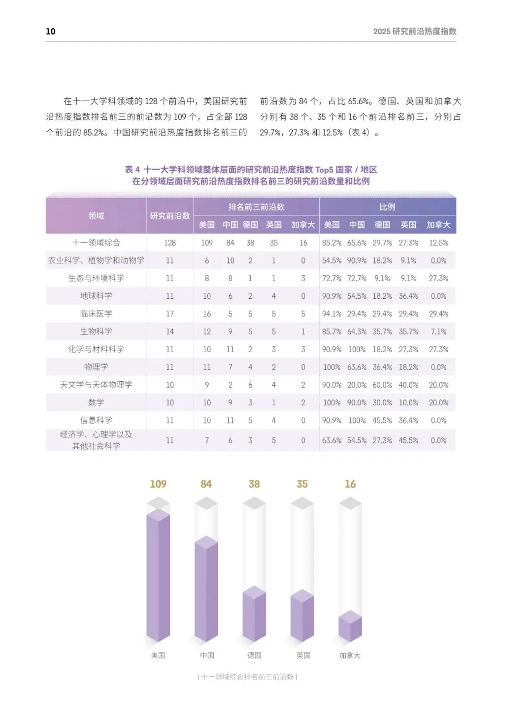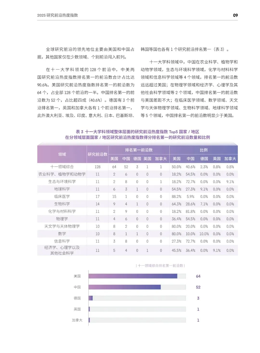 总体格局:美国蝉联综合榜首,在64个前沿(50%)排名第一;中国稳居第二,在52个前沿(40.6%)排名第一;英、德、加分列三至五位,中美两国共同包揽全部11个学科的最高分。