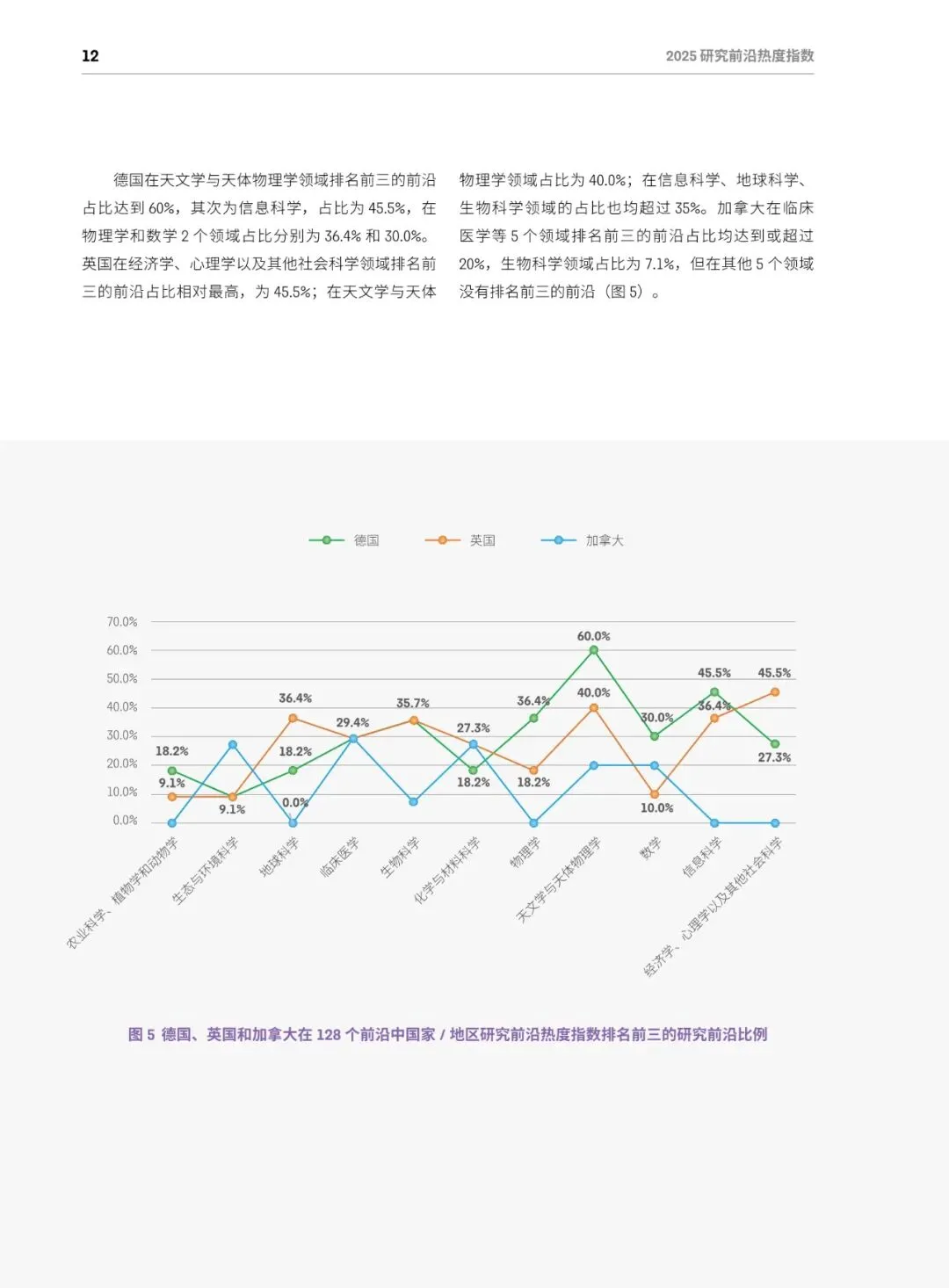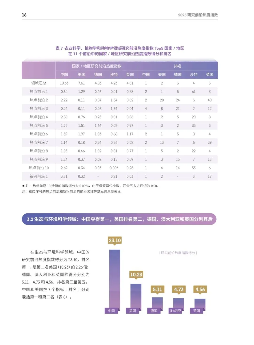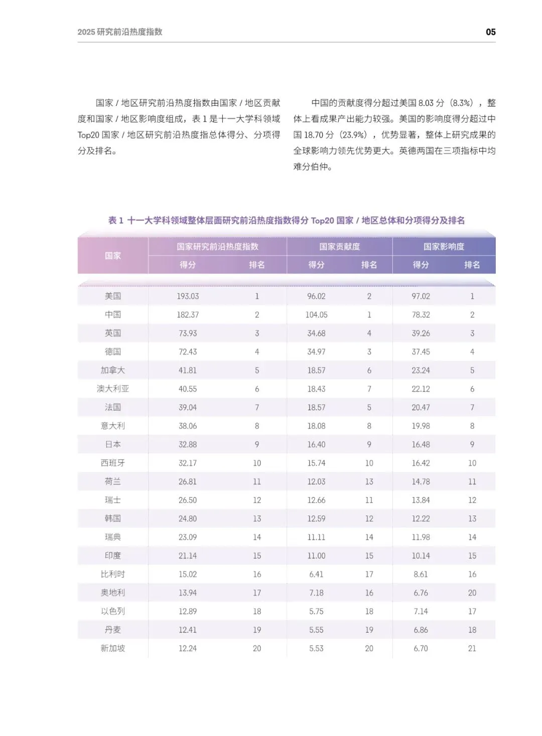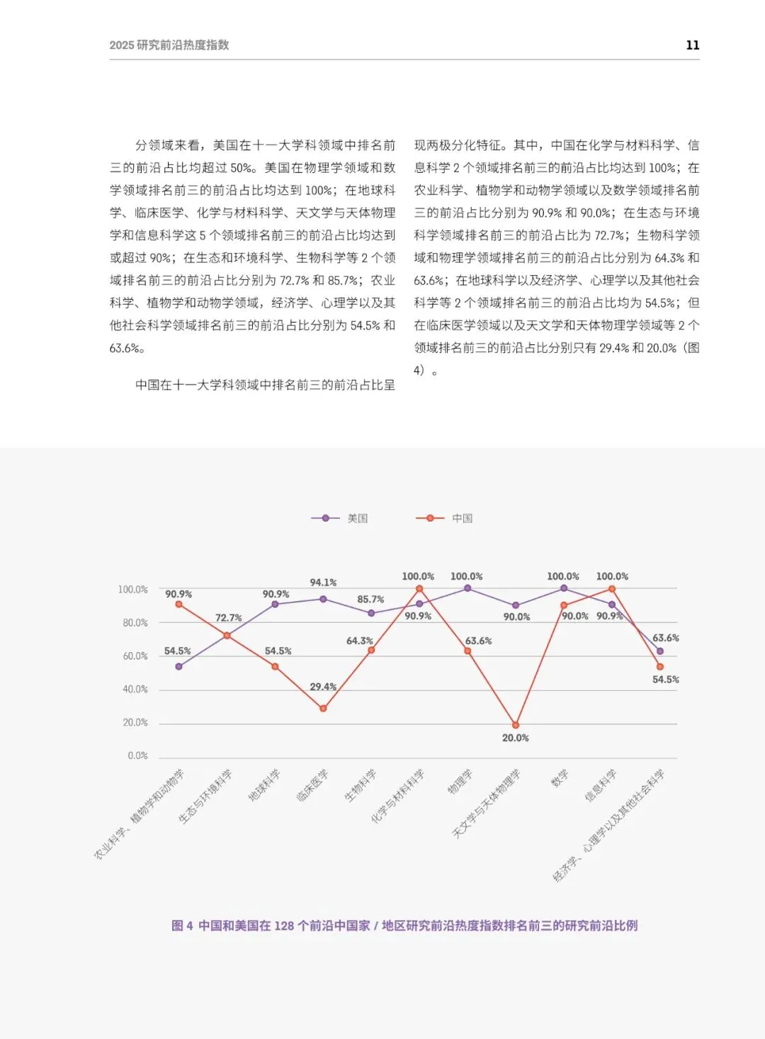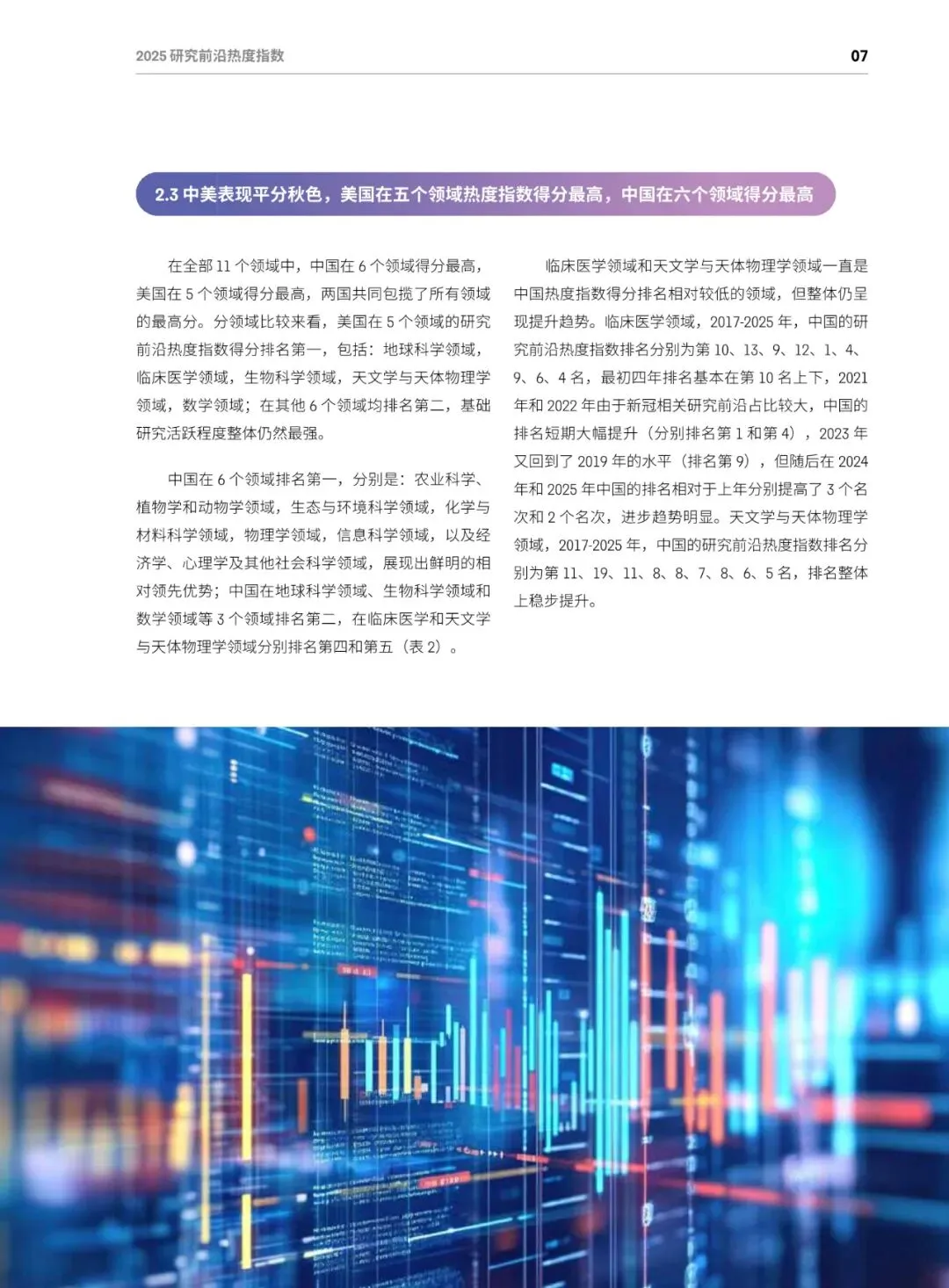总体格局:美国蝉联综合榜首,在64个前沿(50%)排名第一;中国稳居第二,在52个前沿(40.6%)排名第一;英、德、加分列三至五位,中美两国共同包揽全部11个学科的最高分。